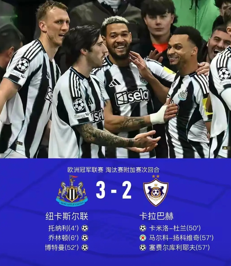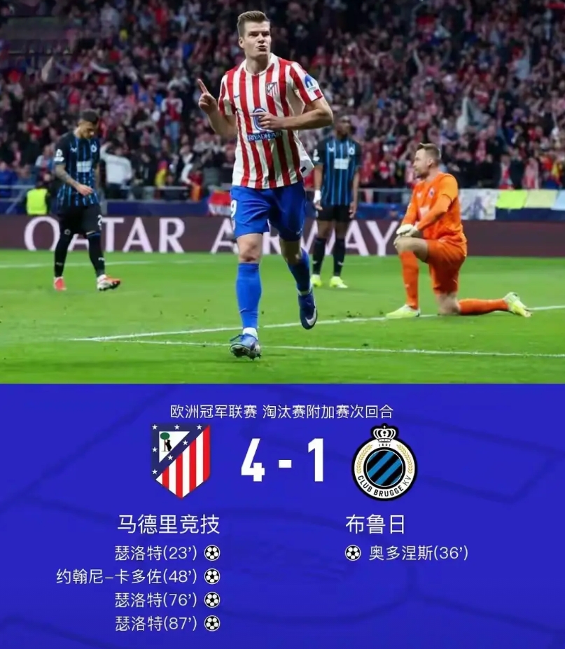 博德闪耀持续闪耀欧冠,意甲球队面临全军覆没。纽卡斯尔双杀晋级,英超球队在欧冠16强独占6席创造记录。 今天凌晨欧冠附加赛先赛四场,挪威球队博德闪耀客场2:1力克意甲领头羊国际米兰,两回合双杀对手,以5:2的总比分昂首晋级欧冠16强。 虽然国际米兰控球率高达70%,射门数超过30次,但是博德闪耀的大门却稳如泰山。反而是劣势下的博德闪耀先下两城,挪威前锋海于格一射一传,帮助球队2:0,总比分5:1领先。大比分领先的博德闪耀略有松懈才让主队勉强扳回一分。 上赛季的欧冠亚军国际米兰就此附加赛止步。博德闪耀则取得欧冠四连胜,且击败的对手都是曼城、马竞、国米这样的豪强球队,持续在欧冠闪耀。 另外两支参加欧冠附加赛的意甲球队尤文图斯主场迎战加拉塔萨雷,首回合2:5惨败;亚特兰大主场迎战多特蒙德,首回合0:2完败。这两支球队翻盘的概率比国际米兰还低,意甲球队面临全军覆没的窘境。 另外三场附加赛,首回合客场6:1横扫对手的纽卡斯尔联回到主场略有松懈,派出大量替补3:2再胜卡拉巴赫,两回合9:3昂首晋级。欧冠16强中英超球队占据6席,创造了一个联赛16强数量的记录。 首回合客场2:0获胜的勒沃库森虽然主场被奥林匹亚科斯0:0逼平,但仍以两回合2:0总比分晋级。 首回合被布鲁日3:3绝平的马竞回到主场4:1大胜对手,以总比分7:4战胜对手晋级。比赛中挪威射手瑟洛特上演帽子戏法。这个凌晨挪威球员表现出色,总共打入5球,帮助本国球队和西甲豪门晋级欧冠16强。