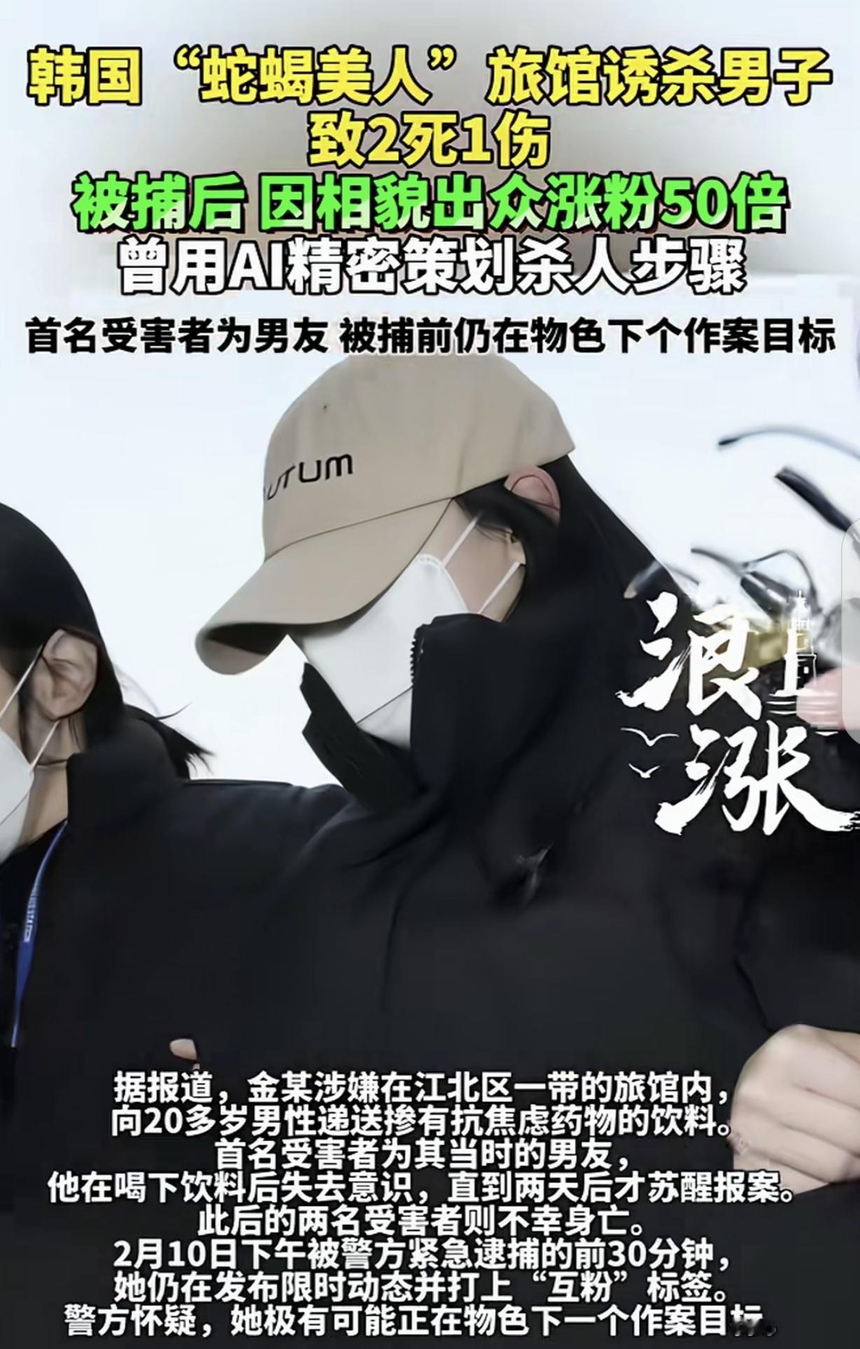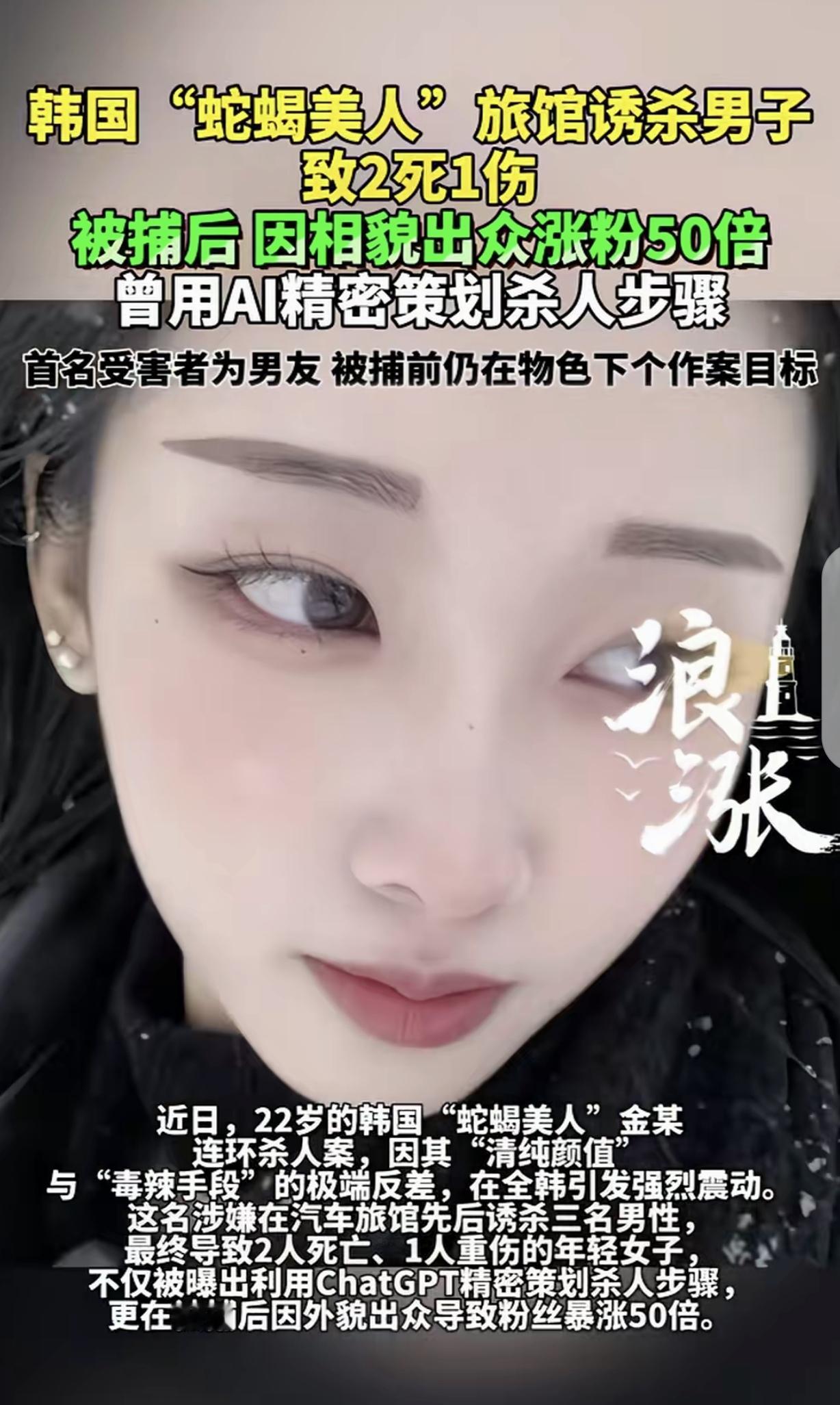 “韩版劳荣枝!”一22岁女子,用Al策划步骤,在旅馆里,给20多岁男子喝掺东西的饮料,其中2个男子死亡,一男子重伤,第一个受害者,竟是她的男友。万万没想到,女子被抓后,因为她长的太漂亮,竟然涨粉50,她被抓前,仍在物色下一个目标。 在韩国,有个22岁的女子金某,外表看起来甜美可人,可谁能想到,她竟干出了令人发指的恶行,被大家称作“韩版劳荣枝”。 金某年纪轻轻,心思却极其歹毒。她利用当时热门的AI技术,精心策划着犯罪步骤。 她把目标锁定在一些20多岁的年轻男子身上,而她的第一个猎物,居然是自己的男友。 也许在金某心里,根本没有所谓的感情,只有满足自己私欲的冰冷算计。 她以各种理由把男子约到旅馆。到了旅馆房间,金某表现得十分温柔体贴,她拿出事先准备好的饮料,笑着递给男子。 男子毫无防备,接过饮料一饮而尽。可他不知道,这看似普通的饮料里,早已被金某掺了致命的东西。 没过多久,男友就感觉身体不适,痛苦地挣扎起来,最终失去了生命。 第一次得手后,金某没有丝毫的愧疚和恐惧,反而更加疯狂。她继续用同样的手段,在旅馆里诱骗其他年轻男子。 她总是装出一副楚楚可怜或者热情开朗的样子,让那些男子放松警惕。 当男子喝下她递来的掺了东西的饮料后,便陷入了绝境。就这样,有2个男子在她的毒手下丧命,还有一个男子虽然侥幸活了下来,但也身受重伤,身心遭受了巨大的创伤。 金某的罪行如此恶劣,可她却没有停手的意思。被抓前,她还在四处物色下一个目标,好像生命在她眼中就像可以随意践踏的蝼蚁。 不过,法网恢恢,疏而不漏。金某的恶行终究还是暴露了,警方迅速将她抓捕归案。 让人意想不到的是,就因为她长得漂亮,在社交平台上竟然还涨了50个粉丝。这实在是荒谬至极,美丽的外表,怎么能成为掩盖罪恶的遮羞布呢? 金某的行为给那些受害者及其家庭带来了无法弥补的伤痛。 那些年轻的生命,本有着美好的未来,却因为她的贪婪和残忍戛然而止。 在与人交往时,一定要保持警惕,不能被外表所迷惑。 法律会严惩金某这样的罪犯,让正义得到伸张,给受害者及其家属一个交代。 金某这事最让人膈应的,是两个极端:一边是她把杀人当儿戏的冷血,另一边是有人因为她长得好看就无脑追捧。 她用AI策划犯罪,连自己男友都下得去手,说明早就没了人性底线。 第一次作案后不害怕反而继续作案,纯粹就是享受掌控别人生死的感觉,这种人比临时起意的凶手更可怕。 至于那些因为她漂亮就粉她的人,真的是三观歪到离谱。 好看的皮囊难道能抵消三条人命、毁了几个家庭的罪恶?这种“颜值即正义”的畸形价值观,说白了就是把是非对错抛在脑后,只看脸不看心。 而且金某到被抓前还在物色下一个目标,要是没被及时制止,不知道还要有多少人遭殃。 这件事也提醒所有人,交友识人绝对不能只看外表。平时看起来再人畜无害,背后可能藏着你想不到的恶意。面对陌生人的示好,多留个心眼没坏处。 根据《韩国刑法典》第250条规定,以杀人目的,用毒药等方法致人死亡的,处死刑或无期徒刑或十年以上有期徒刑。 金某以非法剥夺他人生命为目的,多次用掺毒饮料杀害他人,属于情节极其恶劣的故意杀人行为。 按照该法条,她将面临最高死刑的严厉制裁,以彰显法律对生命权的绝对保护和对恶性犯罪的零容忍。 对此,你怎么看?