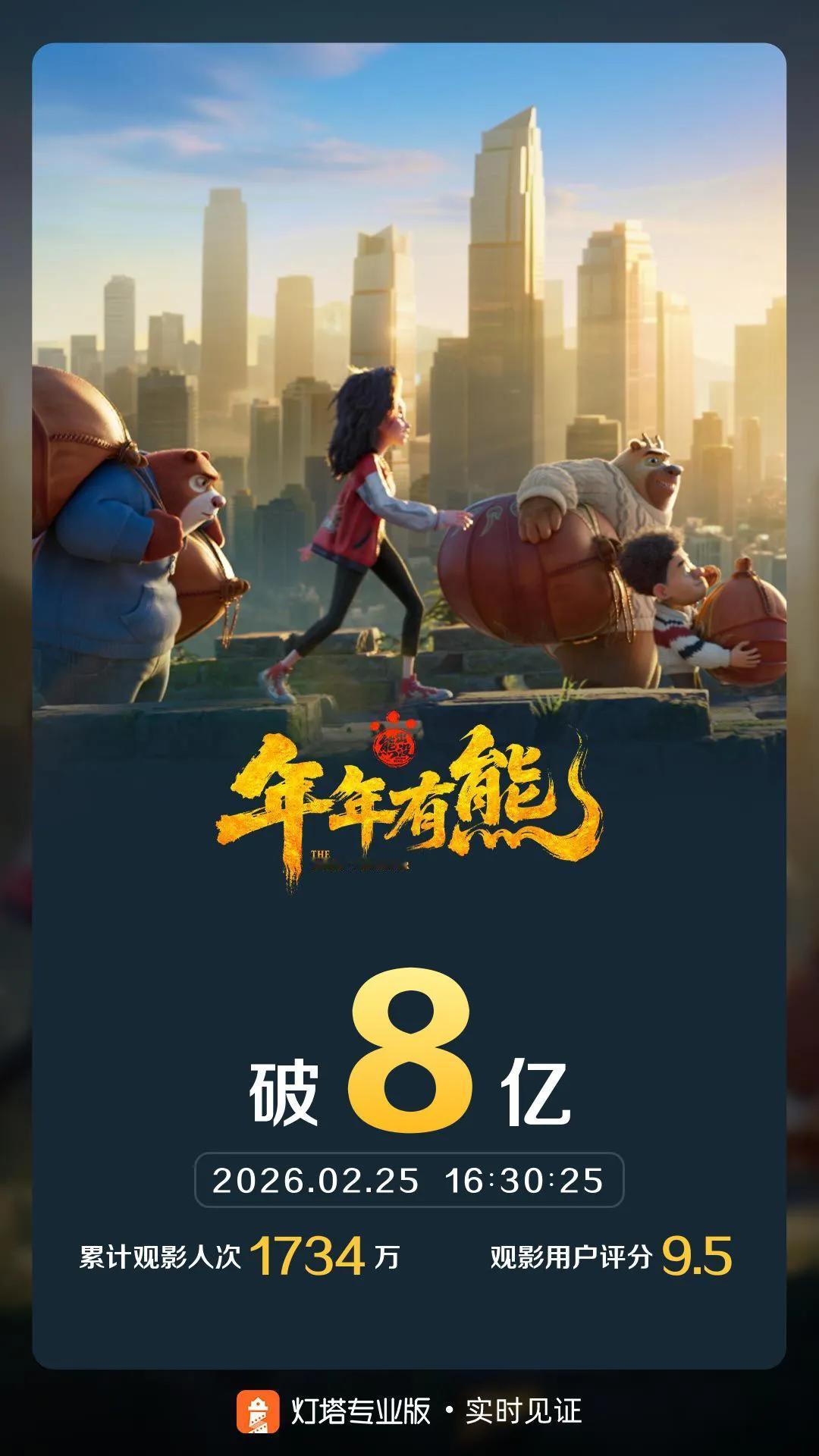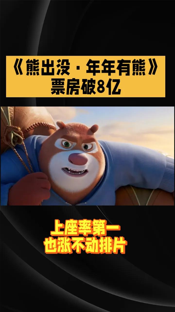 《熊出没·年年有熊》票房破8亿,上座率夺冠也涨不动排片 由方特领衔出品的2026春节档奇幻喜剧动画作品《熊出没·年年有熊》累计综合票房破8亿,已进入《熊出没》系列12部电影中的票房前5,即将超越《熊出没·重启未来》。 《熊出没·年年有熊》在春节假期期间综合上座率在春节档新片中排名第2。初七、初八两天上座率均为第1名,初九上座率也暂时领先,但即便如此,排片占比也没有什么变化,似乎影院宁愿意相信学生会光速开学影响票房,也不信实打实的上座率。