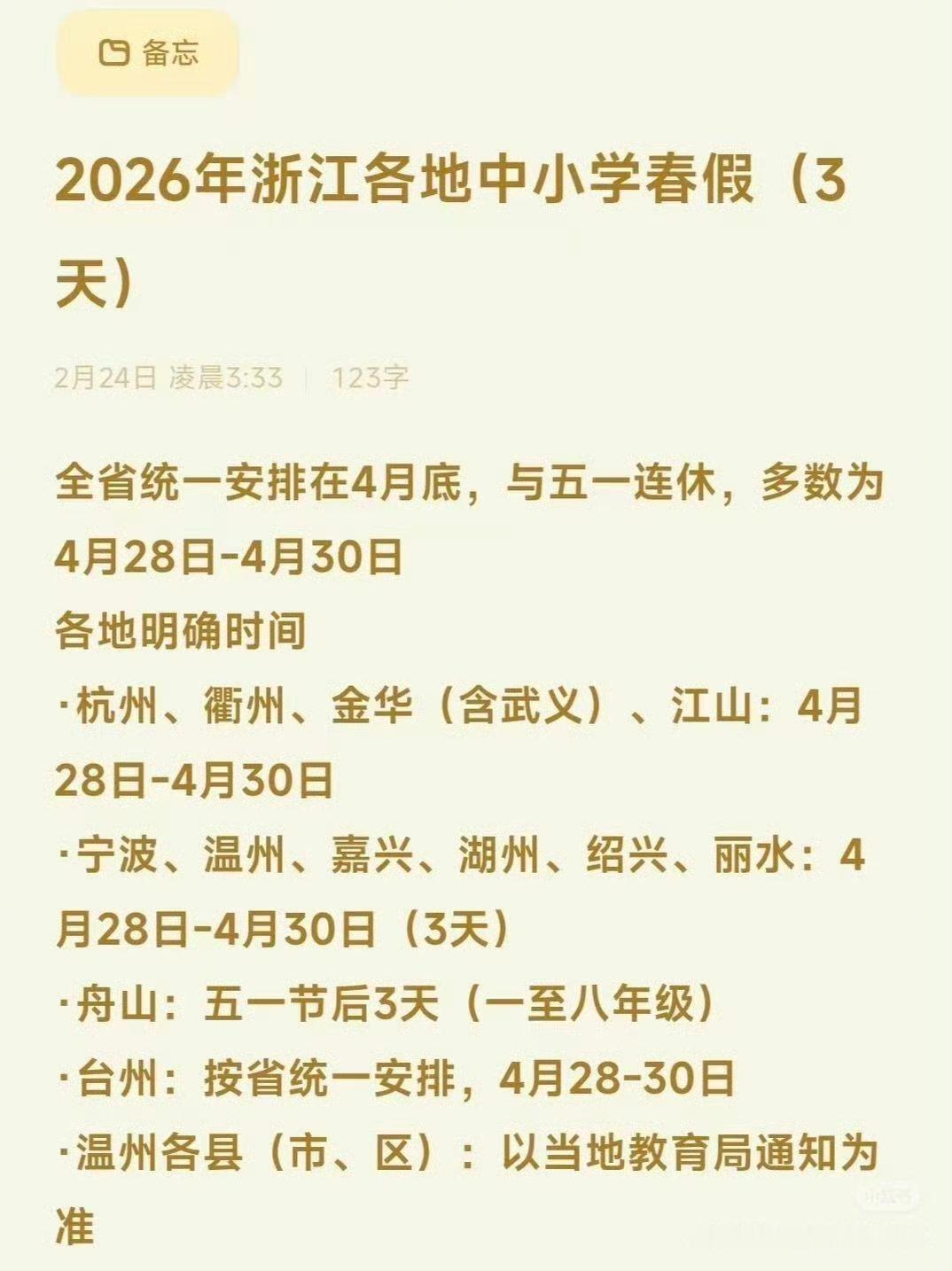 浙江家长们注意继秋假之后春假也来啦 浙江家长们注意⚠️继秋假之后👀春假也来啦🥳看到浙江省中小学的春假安排我直接一个激灵坐起来什么情况,还没开学呢就又有放假消息啦又是一个打工人看了流泪学生党看了开心的假期2026年浙江各地中小学春假全省统一安排在4月份结合去年的统筹信息和网传时间多数地区是4.28-4.30与五一连休简直完美💯有些地方是4.1-4.3(与清明连休)4.28-5.5连休8天!这还不算完,再仔细算一算如果4月27日(周一)再请一天假…好家伙直接从4月25日(周六)开始算起到5月5日这是什么神仙11天长假啊🫢(老板和老师看了都颤抖hhh)又可以安排假期啦!!!赶紧码住
