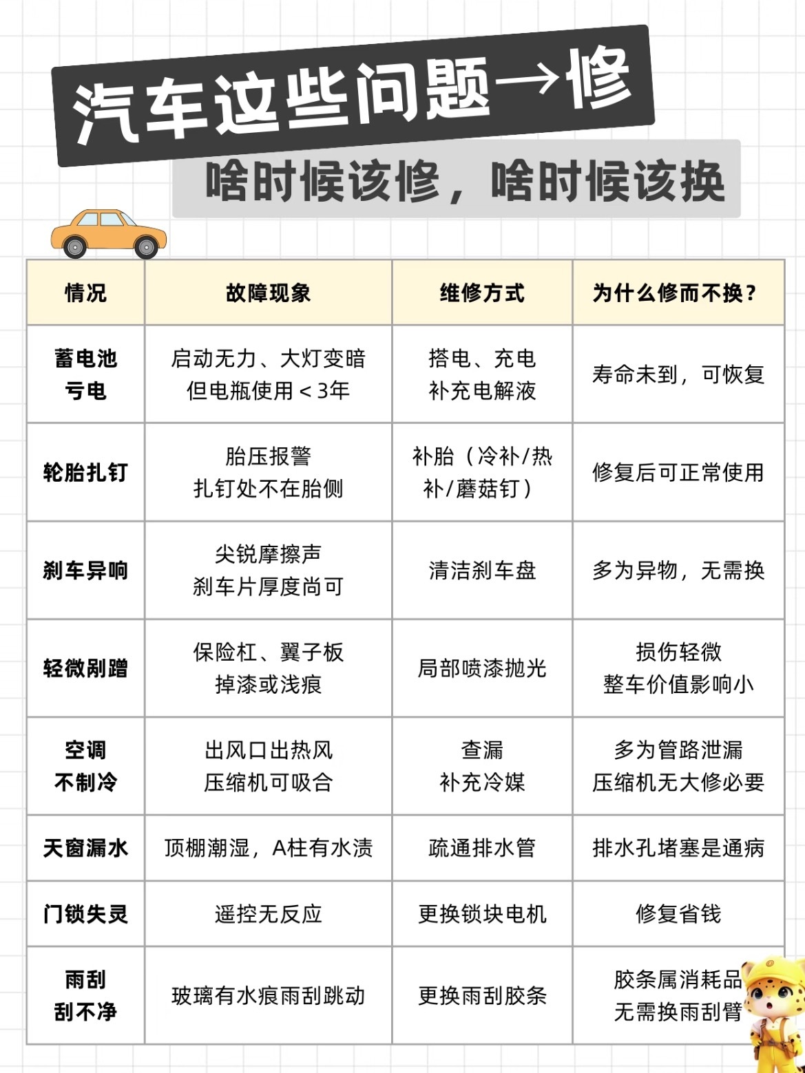 汽车故障,什么时候该修,什么时候该换呢?如上图!车主判断技巧✅寿命法——易损件(轮胎/电瓶/刹车片)到更换周期直接换,修不划算。✅安全法——涉及爆胎、制动、气囊的故障,不修直接换。✅费用法——维修费超过新件价格的50%,优先换新。✅复发率——天窗排水、灯罩氧化这类修完能用2年以上,可修;双离合抖、大灯进水这类修完半年又犯,直接换。我与汽车的日常大v聊车