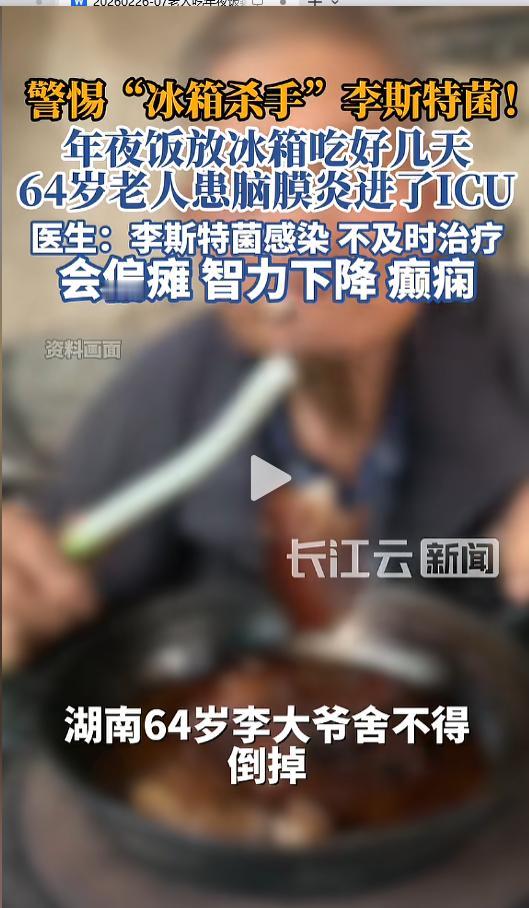 “悲剧还是发生了!”近日,湖南,一老人年夜饭做多了,觉得扔了可惜,就放冰箱里面冷藏着。一连吃了四五天后,老人突然开始抽搐、发烧。家人见状赶紧送往了医院,检查后发现患上了脑膜炎,就是吃剩饭吃的!网友:别觉得可惜,该扔就扔! 过年期间,不少人为了图个年年有余的喜庆,年夜饭都会多做一些,甚至还有“大年三十做一顿,剩饭连续吃七天”的段子。当段子照进现实,可能就是个悲剧。 据媒体2月25日报道,李大爷今年64岁了,过年的时候年夜饭做了不少。他舍不得扔掉,就放进冰箱里冷藏保存,一连吃了四五天。 这一天,李大爷突然开始抽搐,身体也发起了高烧,甚至出现不认人的情况,家里人赶忙把他送到了医院。 在医院检查后,老人被确诊为脑膜炎,病因是感染了李斯特菌。这病菌就是从剩饭里来的。 李斯特菌和其他细菌不太一样,别的细菌在冰箱4℃的温度下会被冻死,它却能好好活着,甚至还能缓慢繁殖。这种病菌非常危险,一旦治疗不及时,会导致偏瘫、癫痫等病症。老年人体质弱,很容易就被感染了。 网友看后表示,真正的节俭不是多吃剩饭,而是做饭的时候做成正好。真要是吃剩饭啊也一定要回锅热一热再吃,放时间长了的千万不要再吃!万一引起点头疼脑热的,看病花的钱可比省的多多了! 信息来源:《年夜饭舍不得倒放冰箱吃好几天,64岁老人高烧抽搐患上脑膜炎,医生提醒!