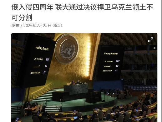 诡异!中美这一次难得一致,带头投了弃权票!在俄乌战争四周年纪念日,联合国大会以压倒性多数通过一项支持乌克兰持久和平的决议草案,联合国大会以107票赞成、12票反对、51票弃权的投票结果,支持捍卫乌克兰领土不可分割。而这一投票结果中,俄罗斯、白罗斯、苏丹投了反对票,中国和美国投弃权票。 这份题为“支持乌克兰实现持久和平”的决议草案,由乌克兰与拉脱维亚联合发起,草案核心呼吁俄乌双方立即实现全面、无条件停火,并重申要在国际法与《联合国宪章》框架下推动危机的全面解决,同时草案还纳入了全面交换战俘、释放非法拘押人员等人道主义内容。 大会最终给出了107票赞成、12票反对、51票弃权的压倒性表决结果,俄罗斯、白俄罗斯、苏丹等国家明确投出了反对票,而中国与美国这两个在国际舞台上长期博弈的大国,却罕见地站在了同一阵营,双双按下了弃权键。 中国常驻联合国代表团参赞滕飞在投票后第一时间作出解释性发言,他直言中方的弃权票,完全契合中国在乌克兰问题上始终坚守的原则立场。 滕飞强调,中方始终认可各国主权与领土完整的神圣性,始终主张恪守《联合国宪章》的宗旨与原则,也始终认为各方的合理安全关切都应得到同等重视,所有朝着和平方向努力的尝试都值得国际社会点赞。 当下的乌克兰问题,正步入推动谈判解决的关键阶段,各类对话接触在近期密集推进,各方讨论的焦点也逐步从表面分歧转向危机背后的实质性问题,中方对这样的积极势头表达了明确欢迎。 中方在发言中进一步表态,中方将持续鼓励和支持一切致力于和平的行动,呼吁当事各方珍惜当前的沟通氛围,持续积累共识,力争达成一份全面、持久且具备约束力的和平协议。 中方同时提出,国际社会需要着手解决危机的根源性问题,共同搭建起更均衡、有效、可持续的欧洲安全架构,让欧洲的长治久安真正落地。 美国的弃权选择,同样是基于自身战略考量的理性决策。作为俄乌冲突的重要外部参与方,美国既需要兼顾盟友体系内对乌克兰的支持立场,又不得不正视冲突长期化带来的战略消耗与全球连锁反应。 这份决议草案的通过,固然反映了多数国家对和平的渴望,但中美两国的同步弃权,更凸显了国际社会在解决危机路径上的深层分歧。 两国的立场看似一致,背后的逻辑却各有侧重,中国着眼于兼顾各方合理关切、推动政治解决,美国则平衡着盟友诉求与自身战略利益。 这场在四周年节点上的投票,不仅是对过去四年冲突的复盘,更是对未来和平进程的一次风向标式表态。 国际社会都清楚,真正的和平无法仅靠一纸决议实现,唯有让对话谈判成为各方的共同行动,让合理安全关切得到实质回应,乌克兰的土地才能真正迎来持久的平静。