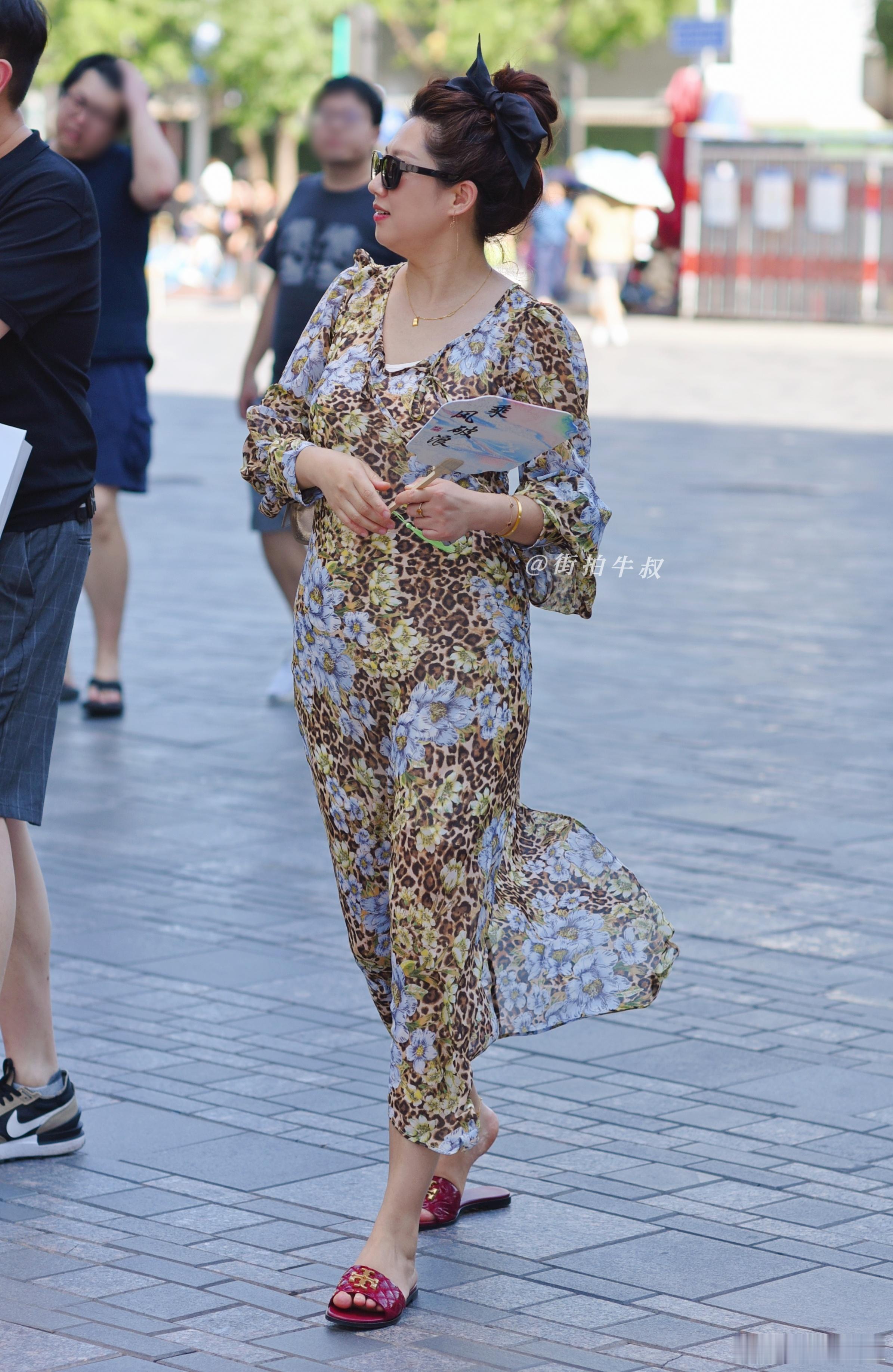 豹纹与佩斯利花纹的碰撞,露背设计是大胆的留白。停车场的水泥森林里,她是最野性的艺