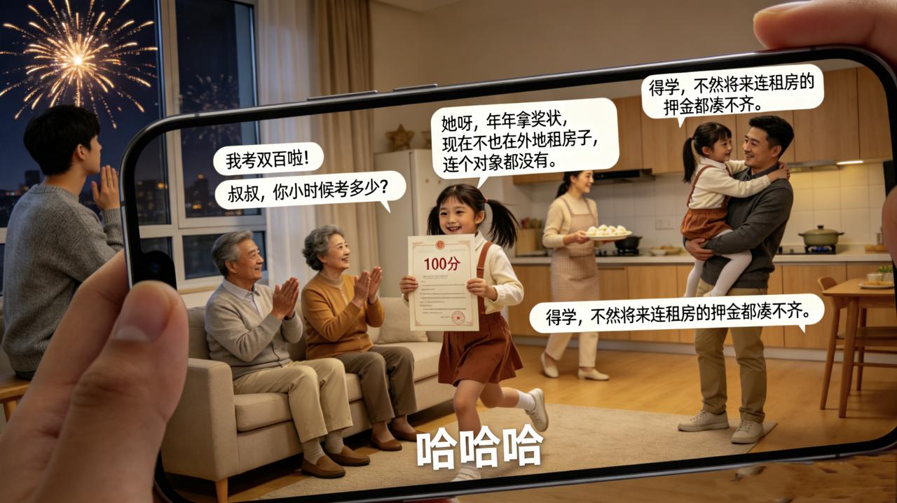 初五家庭群视频,六岁侄女举着成绩单满屋跑:“我考双百啦!” 屏幕里外公外婆鼓掌叫好。她突然凑近镜头压低声音:“叔叔,你小时候考多少?” 我还没张嘴,我妈端着饺子路过:“她呀,年年拿奖状,现在不也在外地租房子,连个对象都没有。” 镜头那边瞬间安静。侄女瞪圆眼睛:“那我还用好好学习吗?” 我爸一把抱起她:“得学,不然将来连租房的押金都凑不齐。” 满屏哈哈哈,只有我盯着窗外的烟花发呆。