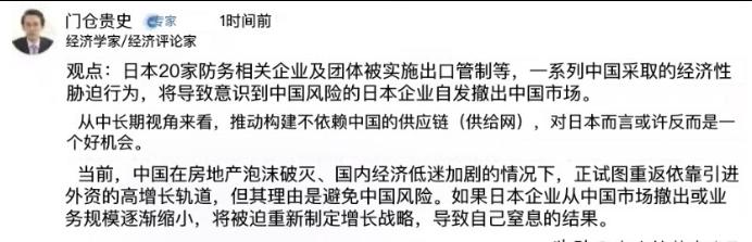 连发两条公告后,日本精英坐不住了:称中方是“作茧自缚,” 马年上班的第一天,中国联发两条公告涉及日本海陆空军工企业,就在全世界震惊不已的同时日本的经济学家坐不住了,他呼吁与日本企业不要太悲观,这对于日本来说是一个机会,中国一系列的行为,将会迫使日本企业自发的撤出中国市场。 同时他再次强调,如果中国如果继续执意为之的话,那么将会导致大批的日本企业还有其他外资企业撤出中国市场,对中国经济造成冲击,最终中方将会作茧自缚。 这位跳出来发声的日本经济学家,就是门仓贵史,在日本经济界也算有头有脸的人物,说白了就是日本精英圈层的“代言人”,他这番话,与其说是给日本企业打气,不如说是硬撑着给自己人找台阶下。 门仓贵史嘴硬说这是“机会”,说能倒逼日本企业撤出中国,构建不依赖中国的供应链,这话听着挺有道理,实则全是自欺欺人。 咱们先说说日本企业能不能轻易撤出中国——日本制造业这些年早就被中国供应链“养懒了”,他们一直搞“零库存”模式,说白了就是随用随采,不囤货、省成本,而这种模式能玩得转,全靠中国供应链的快速响应,从中国工厂运零部件到日本生产线,也就几天时间。 要是真撤出中国,想把产能转移到东南亚或者印度,先不说成本直接涨30%以上,交货周期还得翻倍,到时候日本企业的生产线都得停摆,这可不是“短期痛苦”,搞不好就是“长期瘫痪”。 日本压根离不开中国的核心资源,这一点门仓贵史故意避而不谈。就说稀土吧,用于导弹制导、电动车电机的重稀土,日本对华依赖度近乎100%,就算这些年拼命找替代渠道,到现在依赖度也没降多少,甚至还有日本企业偷偷通过东南亚国家“曲线采购”中国稀土。 还有高纯度的镓和锗,日本的依赖度分别达到90%和85%,这些东西都是日本军工和高科技产业的“命根子”,中国一管控,他们连导弹、雷达都造不出来,还谈什么构建自主供应链? 他还放话,说中国继续这样做,会导致大批日企和其他外资撤出,让中国经济受冲击,中方最终会“作茧自缚”。这话就更有意思了,仿佛忘了日本企业在华有多深的根基——截至2025年,在华日资企业就超过1万家,光上海就有一万多家,大连也有四千多家,这些企业雇佣了上百万中国员工,也赚足了中国市场的钱。 优衣库、无印良品这些咱们熟悉的品牌,扎根中国这么多年,早就离不开中国的消费市场;丰田、本田的汽车,37%的零部件都来自中国,核心部件的依赖度更是高达79%,真要是撤出中国,受损的可不只是中国,日本企业自己先得亏得底朝天。 再说了,中国的公告可不是“一刀切”的全面封锁,而是精准针对军工相关实体,普通民用企业压根不受影响。中方早就说得很明白,不搞全面脱钩,但涉及国家安全和核心利益,底线绝对不能碰。 日本这些年一直在加速“再军事化”,防卫预算连续14年增长,近五年增幅超过60%,高市早苗政府还一个劲放宽防卫装备出口规则,甚至鼓噪“拥核”,触碰“无核三原则”的红线,这些军工企业一边在中国赚钱,一边帮日本造进攻性武器,中国能坐视不管吗? 门仓贵史的这番言论,本质上就是日本精英圈层的“自我安慰”。他们心里比谁都清楚,日本经济对中国的依赖有多深,供应链绑定有多紧,可又拉不下脸承认自己的被动,只能嘴硬说这是“机会”,说中方会“作茧自缚”。 说白了,就是打肿脸充胖子——短期的痛苦是真实的,长期的“机会”是虚幻的,真要是逼得中国进一步收紧管控,别说构建自主供应链了,日本的军工产业能不能撑下去,都是个未知数。 其实大家心里都有数,中日经贸往来这么密切,供应链深度交织,谁也离不开谁。中方的公告,不是要搞对抗,而是给日本敲个警钟:别一边想着在军事上搞扩张,一边又想在经济上赚中国的钱,天下没有这么好的事。 可门仓贵史这些日本精英,偏偏要揣着明白装糊涂,硬把“被动”说成“机会”,硬把“自己的困境”说成“中方的失误”,这种自欺欺人的话,也就只能骗骗自己人罢了。