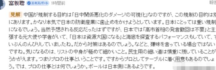 2月24日,日本教授富坂聪“一眼就看透了”中国的管制措施,他表示,中国不是在‘报复’,而是在精准‘踩刹车’,日本现在的表现太悠闲了,应该注意到中方给日本留下来‘谈判通道’。 说白了,富坂聪教授这话只说对了一半,中国这哪里是留谈判通道,分明是给日本的军国主义复活行径踩急刹车,再不停步,下一步就不是踩刹车,而是直接拉手刹了! 2月24日,这位日本教授的表态刷屏全网,不少人还觉得他看得通透,可在我看来,他还是太客气,没看透中国真正的底线。 其实不用多说,大家心里都清楚,中国已经忍日本太久太久了,以前总说“一衣带水”,念着点邻里情分,哪怕日本在高科技领域跟着美国瞎起哄,我们也没真正下狠手。 就说半导体领域,日本盯着我们的先进制程不放,还跟着美国搞“技术铁三角”,其实就是想卡我们的脖子,断我们的发展路,这种跟着霸权当马前卒的坏事,日本干得可不少。 而且可能有人没注意,中国的反制从来都不是一蹴而就的,而是一步一步收紧绳索,特别有章法,你叫嚣一次,我们就收一点,你再敢蹦跶,我们就再紧一分,说穿了就是先给你点教训,看你服不服,不服就继续加码,直到你认清现实。 就像之前我们对镓、锗等关键原料的出口管制,一下就戳中了日本的软肋,据说日本92%的镓、87%的锗都靠从中国进口,没了这些,他们的半导体工厂都得停工减产,这就是我们的底气。 富坂聪说中国留了谈判通道,我是真不认同,现在这种局面,哪里还有谈判的必要?更别说道歉了,就算日本现在低头道歉,又有什么实际意义? 过去那么多年,他们从没真正正视自己的问题,反而一步步突破“专守防卫”原则,军费年年暴涨,还计划修改“无核三原则”,甚至搞航母化改装,军国主义复活的苗头越来越明显。 这种情况下,道歉不过是空洞的口号,不如直接制定一个全面封杀制裁三十年的大纲,彻底遏制他们的野心。 最主要的,时代早就不一样了,我们再也不是以前那个忍气吞声、抱着“政冷经热”幻想的中国了。 现在的我们,早就抛弃了那种毫无作用的自我安慰,开启了精细又专业的点穴式反制,不搞大面积粗放制裁,专挑日本的软肋下手,比如之前对日本二氯硅烷发起反倾销调查,精准打击他们的半导体产业链,这就是我们的实力。 我觉得我们终于告别了“一衣带水”的虚空情怀,不再自欺欺人,在现实的大地上清醒过来,学会用实力捍卫自己的利益。 说到底,日本现在还一副悠闲的样子,殊不知中国的刹车已经越踩越紧,再不清醒,等到绳索彻底勒紧,就再也没有回头的余地了。 以上仅为个人看法,不代表任何立场,大家觉得中国的反制力度够不够?对于日本的行径,你有什么不一样的想法?欢迎在评论区留言讨论。