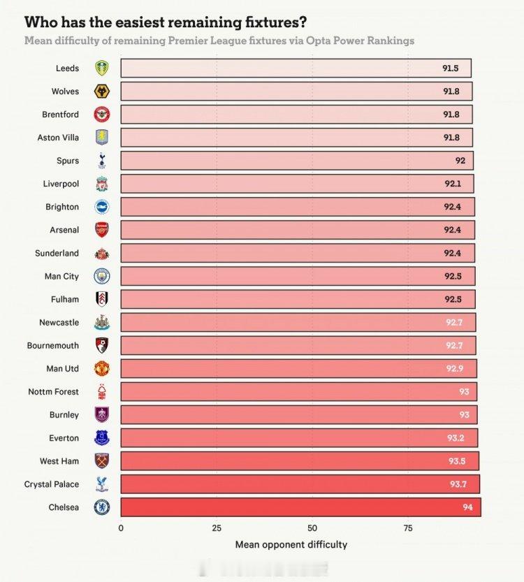 Opta超级计算机评出各队英超剩余赛程难易度榜单,利兹联最容易,切尔西最难。Opta超级计算机列英超剩余赛程难易度榜单(数值越高越难),阿森纳&曼城旗鼓相当:利兹联:91.5阿森纳:92.4曼城:92.5曼联:92.9切尔西:94 英超联赛 阿森纳著名教授