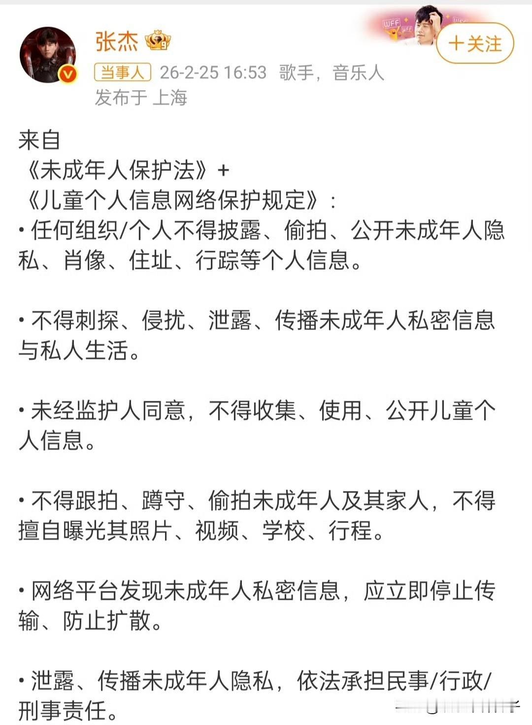 张杰发文力挺谢娜! 2月25日,谢娜在社交平台发文,一连用了很多惊叹号,恳请不要再把镜头对准孩子,看得出来,言语中充满无奈和愤怒,如果不是公众人物,估计就要发飙了。 事情的起因,谢娜带着双胞胎女儿出行,遭到狗仔的全程跟拍,更可恨的是,还透露孩子的上课地点。 随后,张杰发文力挺老婆谢娜,没有多余的废话,直接列举出《未成年人保护法》,态度非常明确,用特殊的方式,来警告狗仔的偷拍行为。 该说不说,关键时候还得是夫妻,张杰和谢娜的做法没毛病,狗仔经常跟拍明星,已经习以为常,不过,偷拍小孩子,就有点过分了,关键还曝光个人隐私,也难怪人家会发火。 如果没记错,赵丽颖也曾发文,恳请媒体不要把镜头对准孩子。 林心如更是直接发飙,怒斥网上曝光女儿的照片。