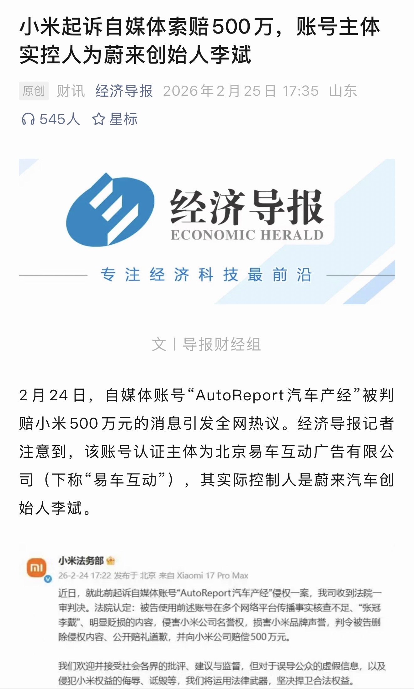 小米前两天起诉并索赔500万的自媒体,被扒出来账号主体实控人是蔚来创始人李斌