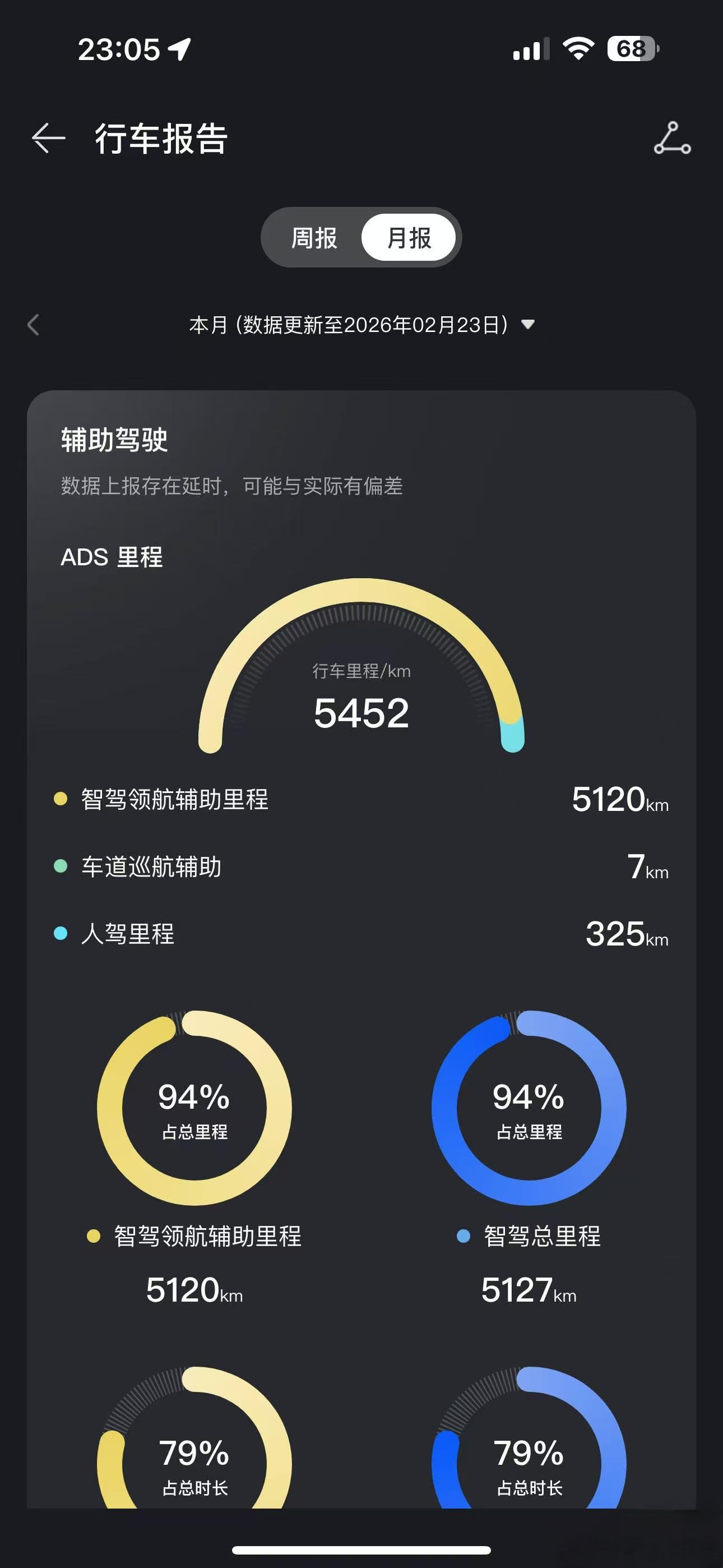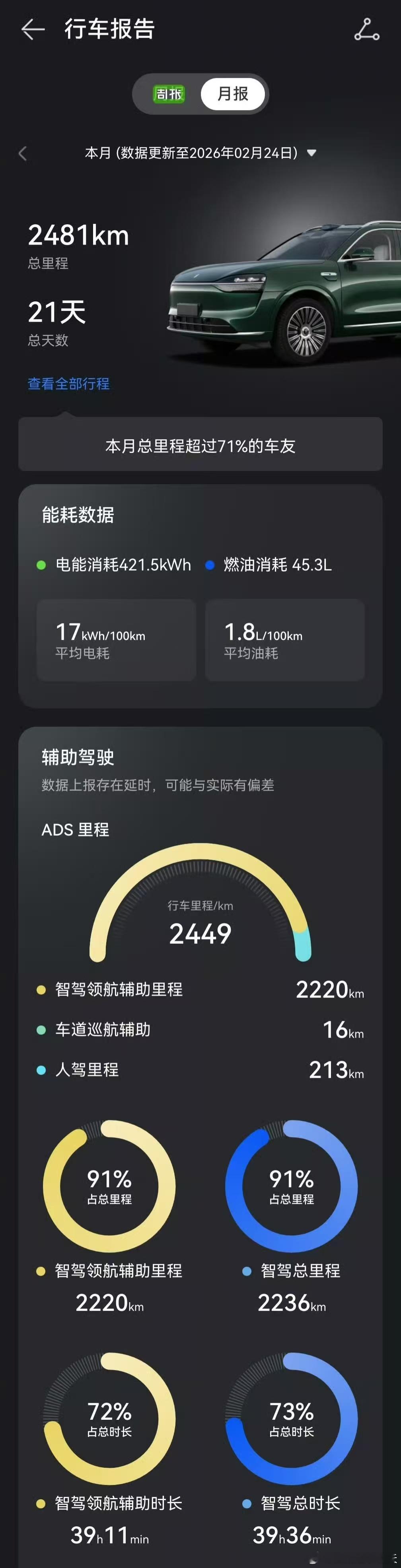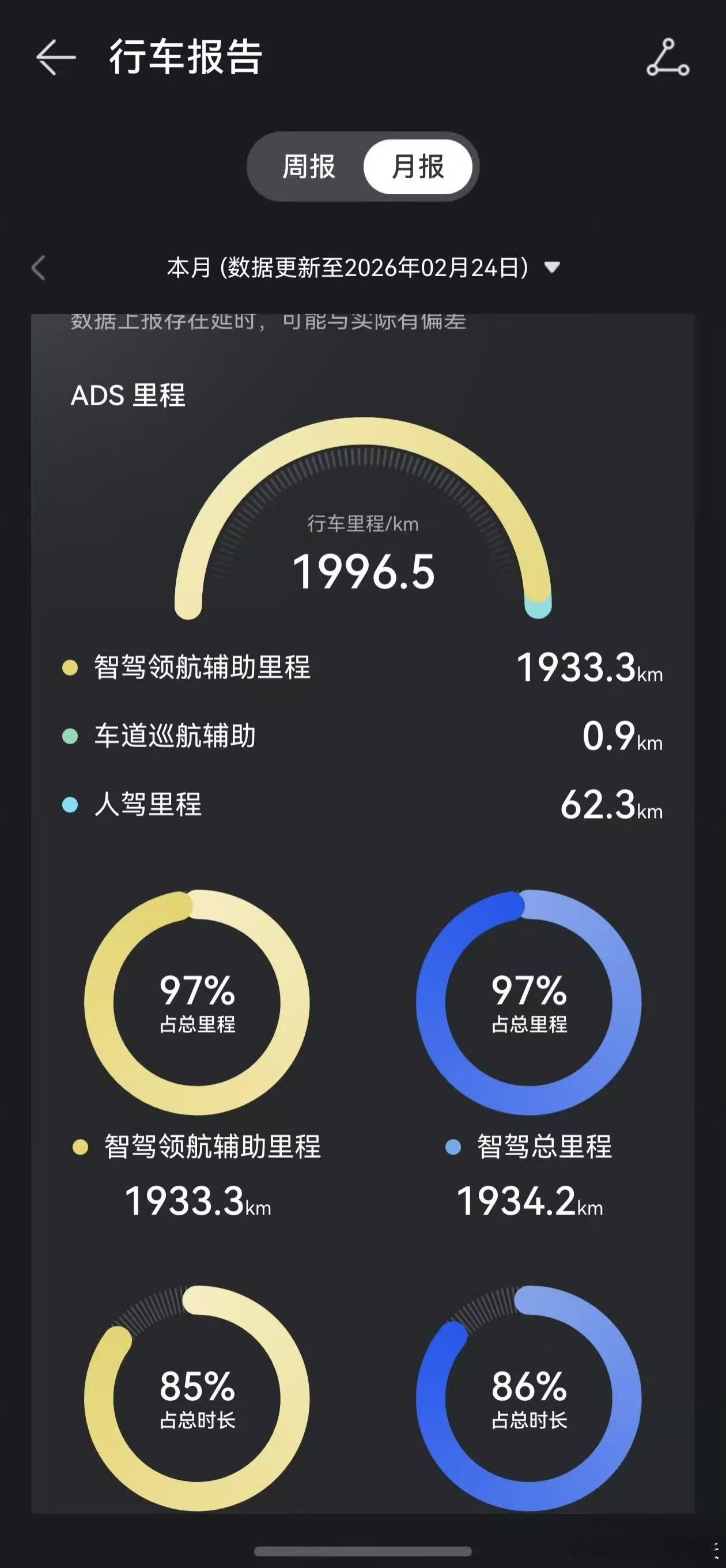 两位“智驾哥”(图1/图2),这个月智驾里程占比都是97%,目前是评论区最高的;还有位“里程哥”(图3),这个月总里程5452公里,其中5127公里智驾里程,智驾里程占比94%,也非常高。