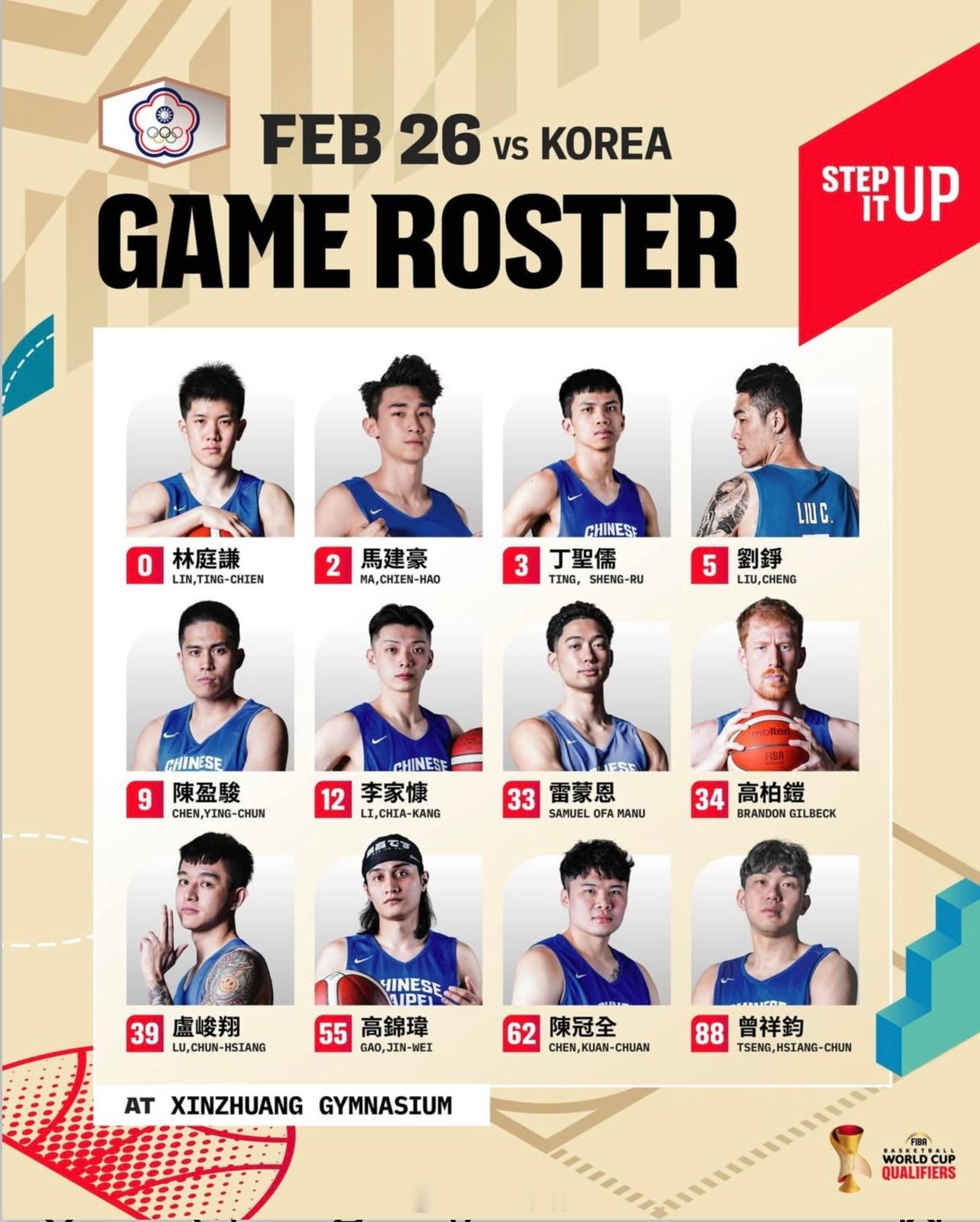 中国台北男篮26日对阵韩国队12人名单公布,CBA三将领衔。