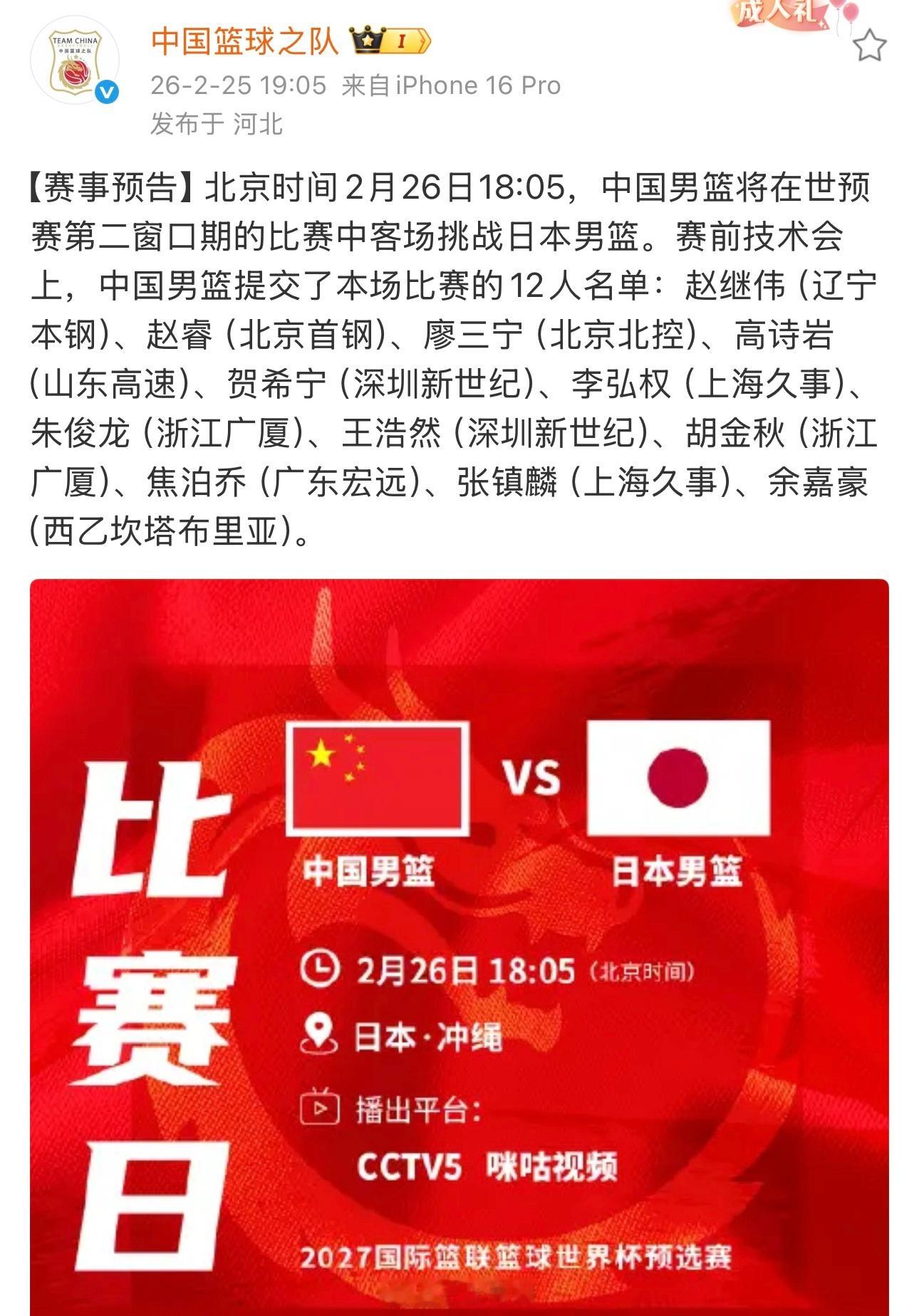 中国男篮对阵日本队12人名单公布,本场胡明轩、赵嘉义无缘。