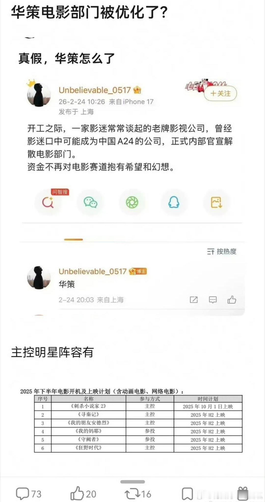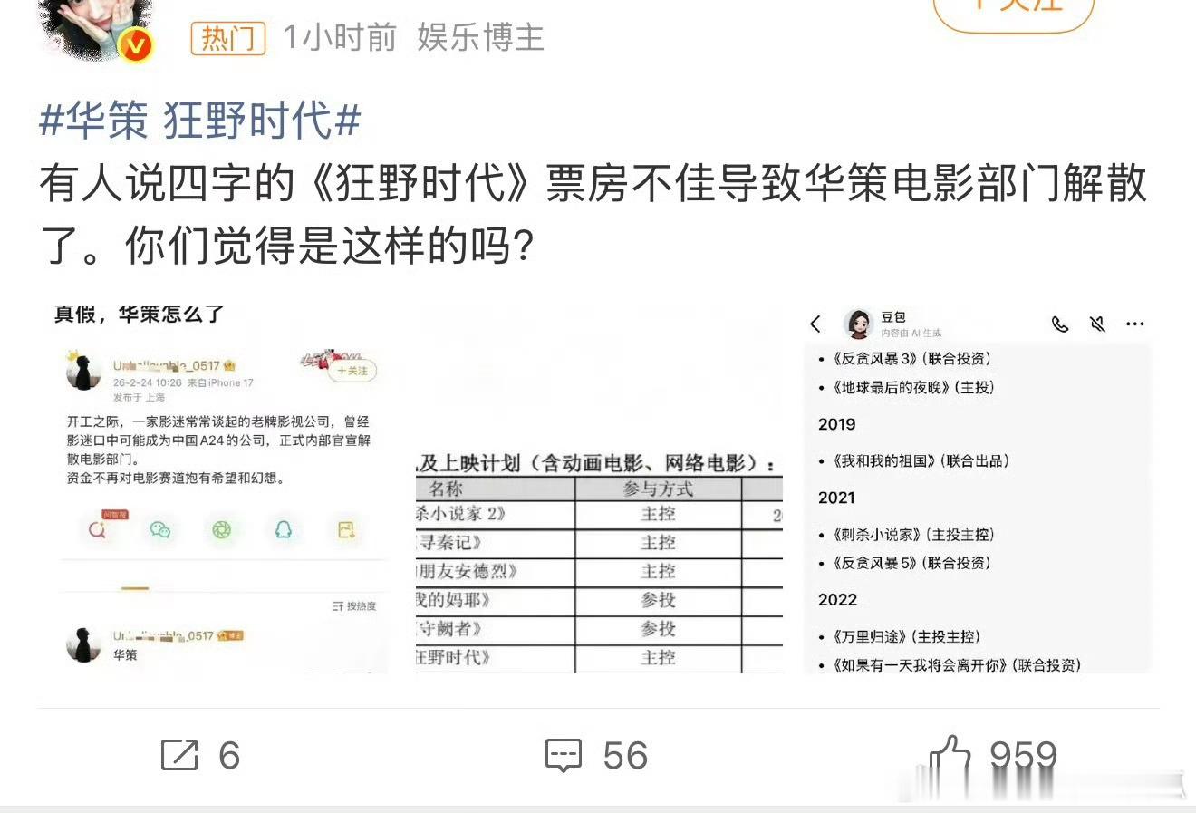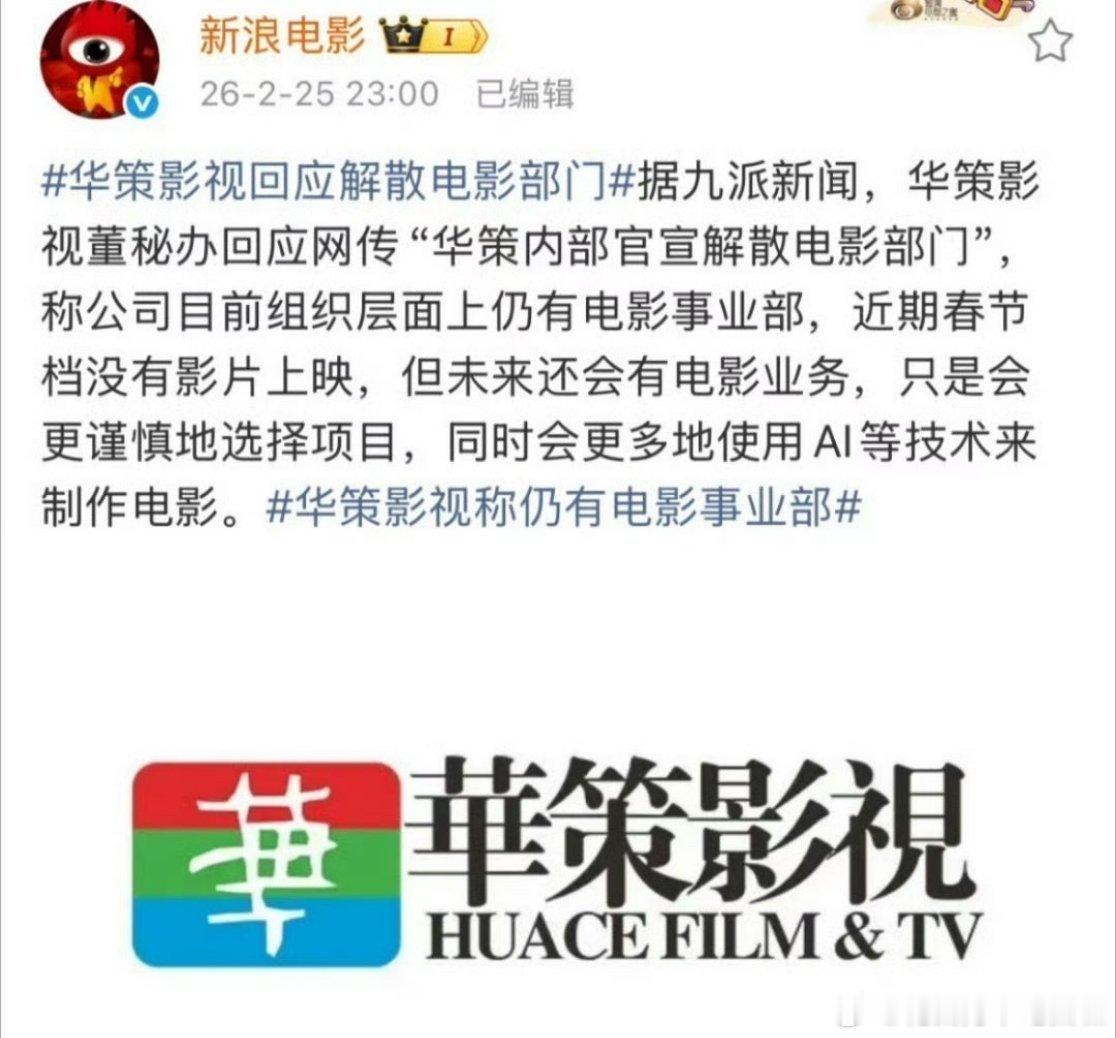 华策解散电影部门引发网友热议,看了一下华策最近主控的电影就包括了易烊千玺的《狂野时代》春节档《惊蛰无声》目前票房仅9亿,被影院经理控 诉强制排片,张艺谋导演加上这个顶配主演阵容,可以说是血扑了、、、、易烊千玺连着两部电影票房不及预期,有网友问四字怎么突然不扛票房了?华策 狂野时代华策解散电影部门