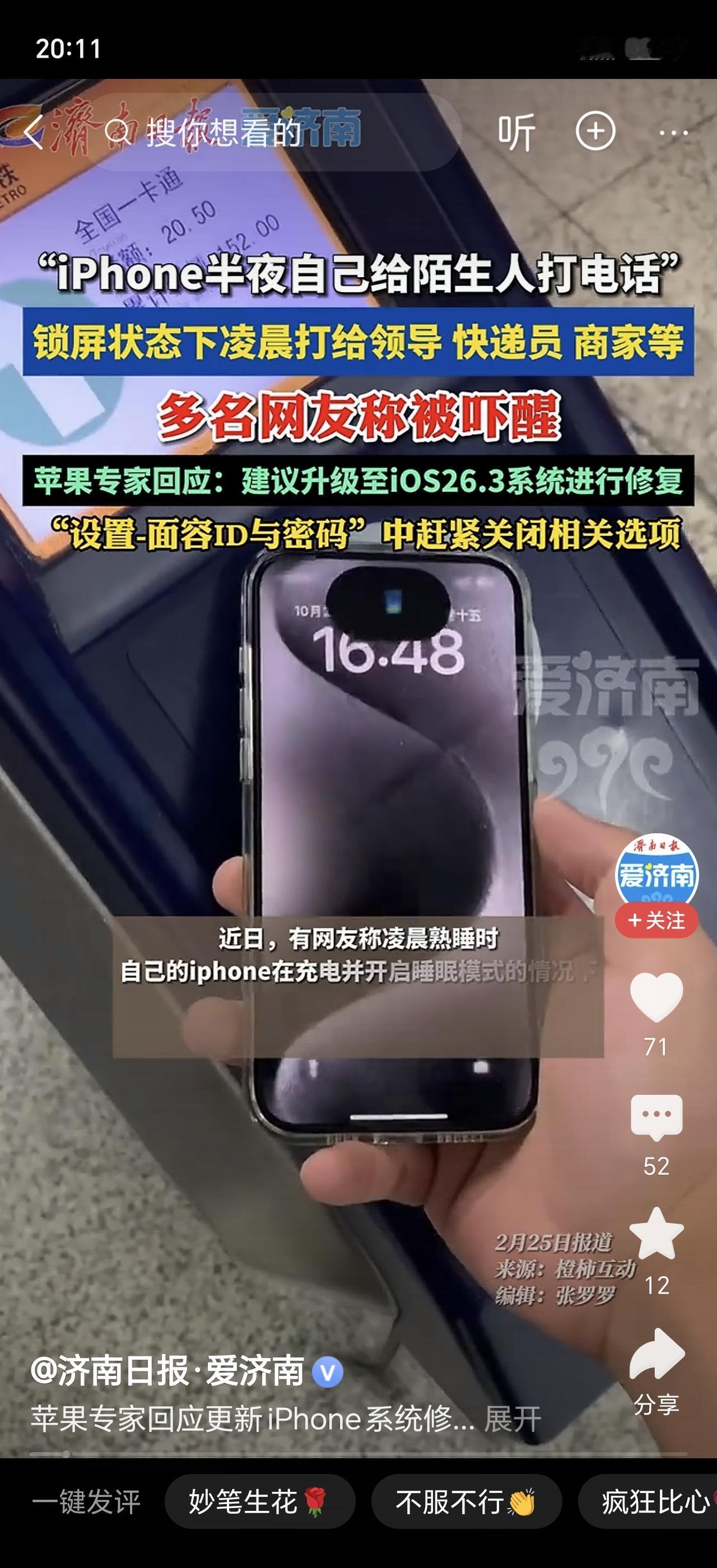 大半夜正睡着,手机突然自己开始打电话!网友直接吓懵:我手机被鬼操控了?! 事情发生在凌晨两点,网友“一一啊”睡得正香,突然被一阵电话背景音乐和“您拨打的用户暂时无人接听”的语音提示惊醒。她迷迷糊糊爬起来一看——手机正在自己拨号!更吓人的是,打的是白天联系过的快递小哥。 她马上搜社交平台,发现遇到这事的人还真不少!有人更惨,手机凌晨自动打了47分钟,还是打给400客服,机器人讲了快一个小时。 最社死的来了——有人半夜自动打给了公司领导!第二天上班都不知道怎么解释,代入一下直接窒息。 有人担心:是不是被黑客入侵了?是不是账号被盗了? 苹果官方连夜回应:别慌,跟账户安全没关系,就是个系统bug。早在去年10月、11月就集中出现过,多发生在凌晨1-4点、手机锁屏充电时,主要针对iOS 26.0.1/26.1版本。 怎么解决?干货来了!Apple专家建议:立刻升级到iOS 26.3,最新系统已修复。同时去「设置-面容ID与密码」,关闭“语音拨号”“今日视图和搜索”“回拨未接来电”三个选项,基本能杜绝问题。 还有人关了这些功能不放心?苹果客服说,实在不行就睡前把手机屏幕朝下放,眼不见为净。 如果是你,大半夜手机突然自己打电话,第一反应是什么?你遇到过这种“灵异事件”吗?评论区聊聊~电话 电话总被挂断 不明来路的电话