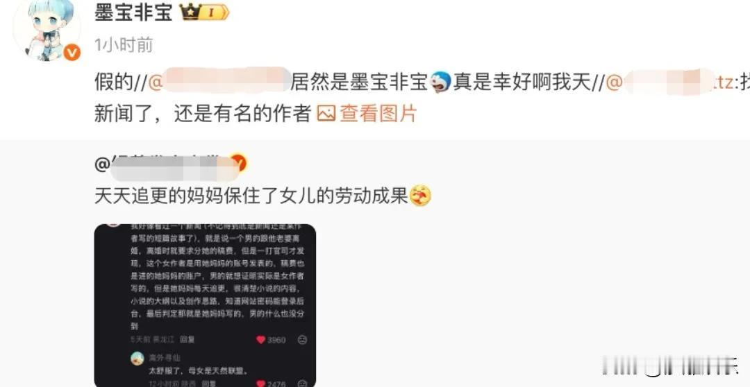 知名编剧墨宝非宝自曝已于2021年离婚:男方是过错方,网传稿费分割是假的! 谁能想到,写出了《亲爱的,热爱的》《周生如故》这么多甜宠名作的墨宝非宝,自己的婚姻却没能迎来圆满结局。 就在今天(2月25日),作家、编剧墨宝非宝突然在社交平台宣布,其实早在2021年就已经离婚了 。她在声明里说得很直接:男方是过错方,财产也已经分割干净 。她还特别提到自己有孩子,不想让小孩看到太多舆论,所以“此事不再多说”,想尽力保护孩子的隐私 。 最近网上传得沸沸扬扬,说她离婚时为了保住稿费各种操作,甚至扯上了什么“母女联手”。对此,墨宝非宝本人亲自下场辟谣,就俩字:“假的”。这也让不少吃瓜群众松了一口气。 作为业内金牌编剧,咱们熟悉的《步步惊心》《何以笙箫默》她都参与编剧,近几年的《在暴雪时分》《很想很想你》也都是她的作品 。写了这么多美好的爱情,现实中却在四年前就已经恢复了单身。 大家也不用过度猜测细节了,既然人家把财产和抚养问题都处理清楚了,咱们就多关注作品,少打扰生活吧。你看过她写的哪部剧?