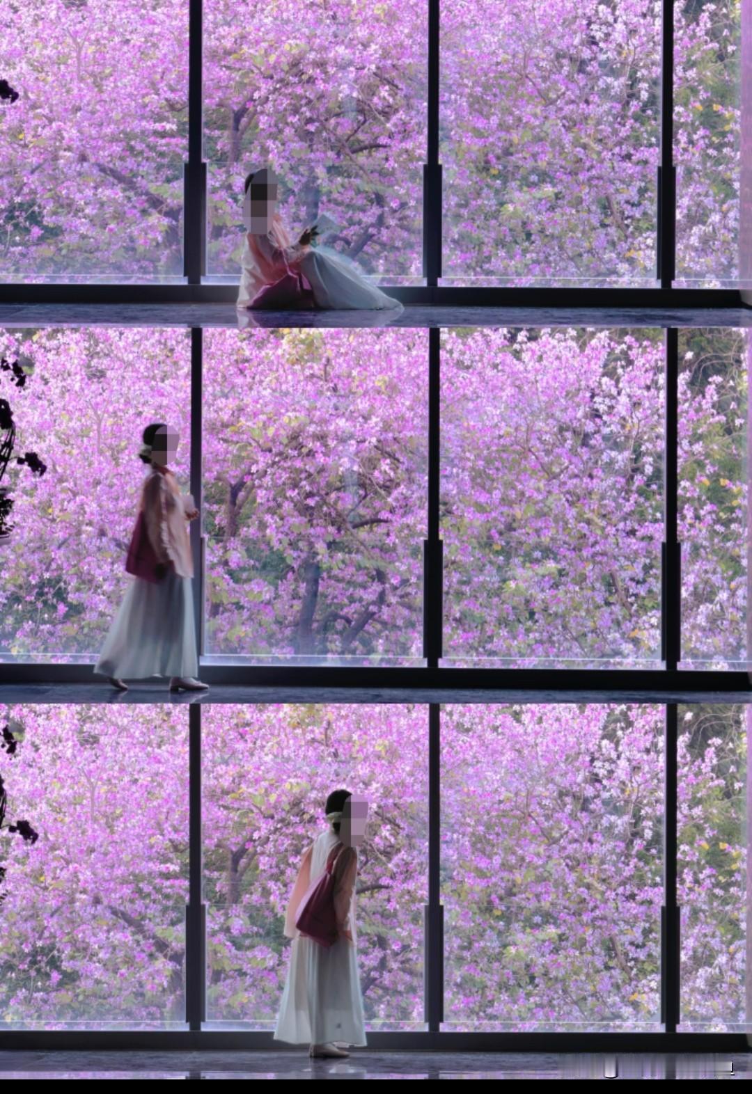 广州,藏着个会“开花”的窗——越秀国际会议中心东门二楼,紫荆花漫过玻璃花窗,粉白花瓣嵌在几何纹路里,阳光透进来,连空气都染上柔光,每一帧都像从动漫里截出来的。 真不是夸张,现场看比照片还绝。紫荆花枝从窗外探进来,刚好搭在蓝色玻璃上,花瓣薄得像纸,风一吹就轻轻晃,影子投在地上,像撒了把碎粉。有姑娘举着手机蹲在走廊拍,长焦镜头里,花和窗棂叠在一起,虚化的背景里透着点蓝天,发朋友圈被问爆“是不是去了日本动漫里的场景”。 地址记准了:越秀国际会议中心东门二楼,地铁2号线越秀公园站出来,步行10分钟就到。免费开放,不用预约,直接上二楼走廊就能拍。但有个小提醒,这里是会议中心,偶尔有人办公,拍照时脚步轻点儿,别喧哗,安静等着风来的瞬间按快门,反而能抓着最自然的画面。 拍照技巧亲测有用:站远些用长焦,能把花拍得更密,玻璃的纹路也更清晰,春日氛围感直接拉满。穿浅色系衣服更出片,白衬衫、米色裙子,往窗边一站,花瓣落在肩头,像自带滤镜。下午三点的光最好,斜斜地打在花上,连花蕊都看得清,不会像正午那样刺眼。 其实不止这扇窗,会议中心周围的路上也种满了紫荆花,走在路上,花瓣时不时飘下来,踩上去软软的。有阿姨带着小孙子捡花瓣,说是要回家夹在书里做书签,小朋友举着粉白的花瓣笑,比花还甜。 这几天广州的春天像被按了加速键,花开得又急又艳。但这种藏在城市角落的小美好,比大片花海更让人惊喜——不用挤景区,不用特意赶路,路过时拐进去拍几张,就能把春天揣进相册里。 花期估计还有一周,想打卡的抓紧了。别觉得“网红打卡点”都是噱头,当你站在那扇花窗下,看阳光穿过花瓣在地上画光斑,会突然懂为什么大家爱追着春天跑——生活里的甜,往往就藏在这些不期而遇的花影里。 最后再念叨句:拍完照顺手把落在地上的垃圾捡捡,别让塑料袋坏了这片春色。让这扇花窗,能安安静静地美到花期结束,挺好。