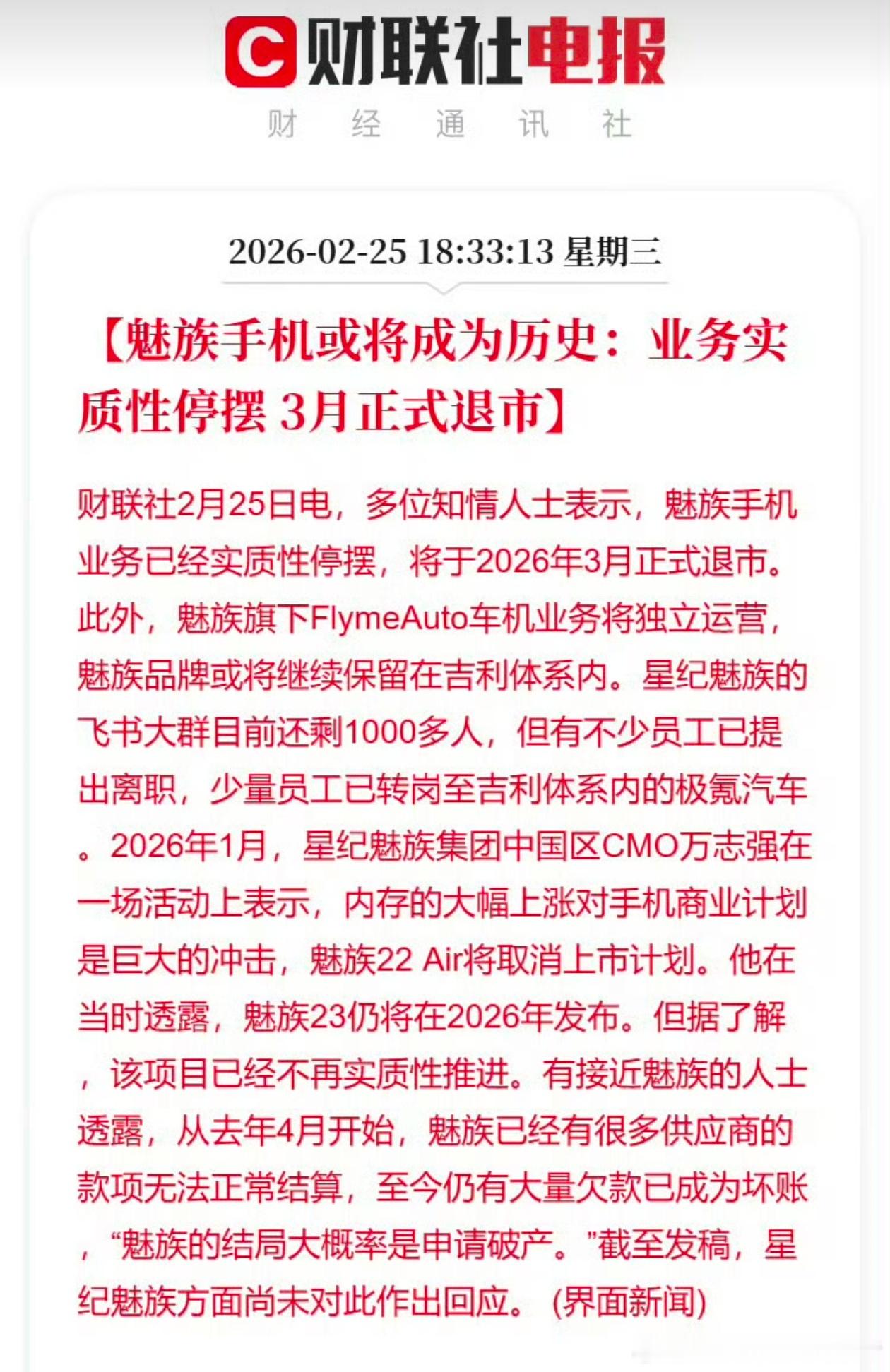 魅族令人痛惜的结局!作为前魅族17 Pro、魅族21和魅族22的用户,看到这个局面还有些伤感。其实,魅族手机很多东西都挺不错的,比如小窗模式,只可惜错过了手机行业黄金竞争期。终究还是迎来了退市的一天,不知未来是否还会有机会继续做。