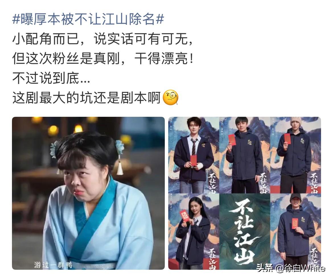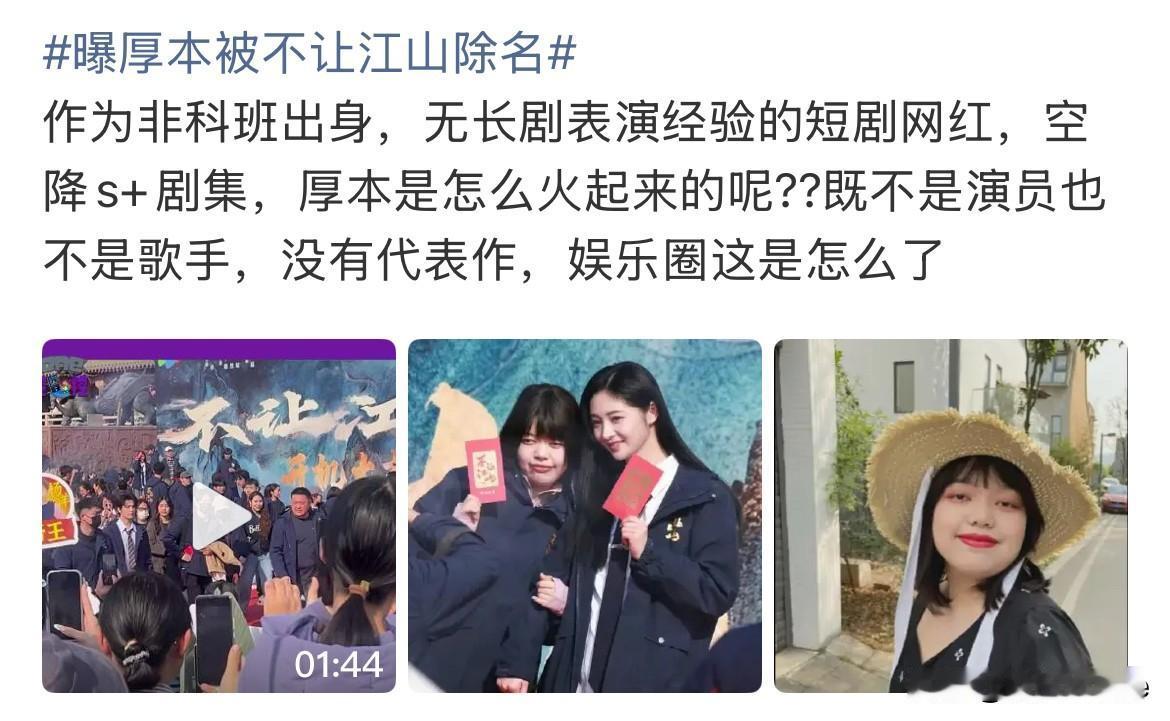 2月25日,赵露思闺蜜厚本被杨洋新剧《不让江山》除名,不再出演《不让江山》中的重要配角,这是《不让江山》开机后杨洋家羊毛提出不满后,唯一达成的诉求! 厚本之所以不受欢迎,最主要的原因是她曾经调侃过杨洋跟王楚然的你是我的人间烟火,其次是杨洋跟赵露思的关系,以及厚本她自己跟赵露思的关系,剪不断理还乱,最后是厚本本身非科班出身,虽然有过表演经验,演过短剧,但剧中表现很一般,羊毛担心她拖杨洋后腿,讲真这些都能理解! 厚本还是好好跟赵露思玩吧,演艺圈还是暂时不要踏入了,除非赵露思进组,给她安排进去,那谁也无话可说 杨洋