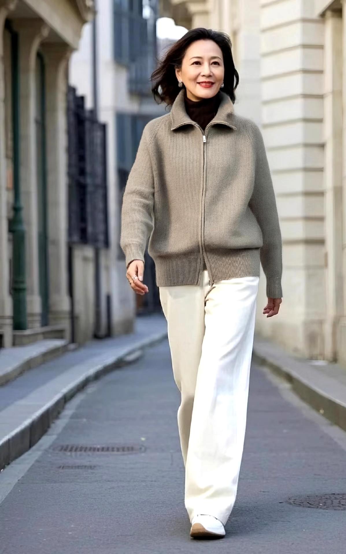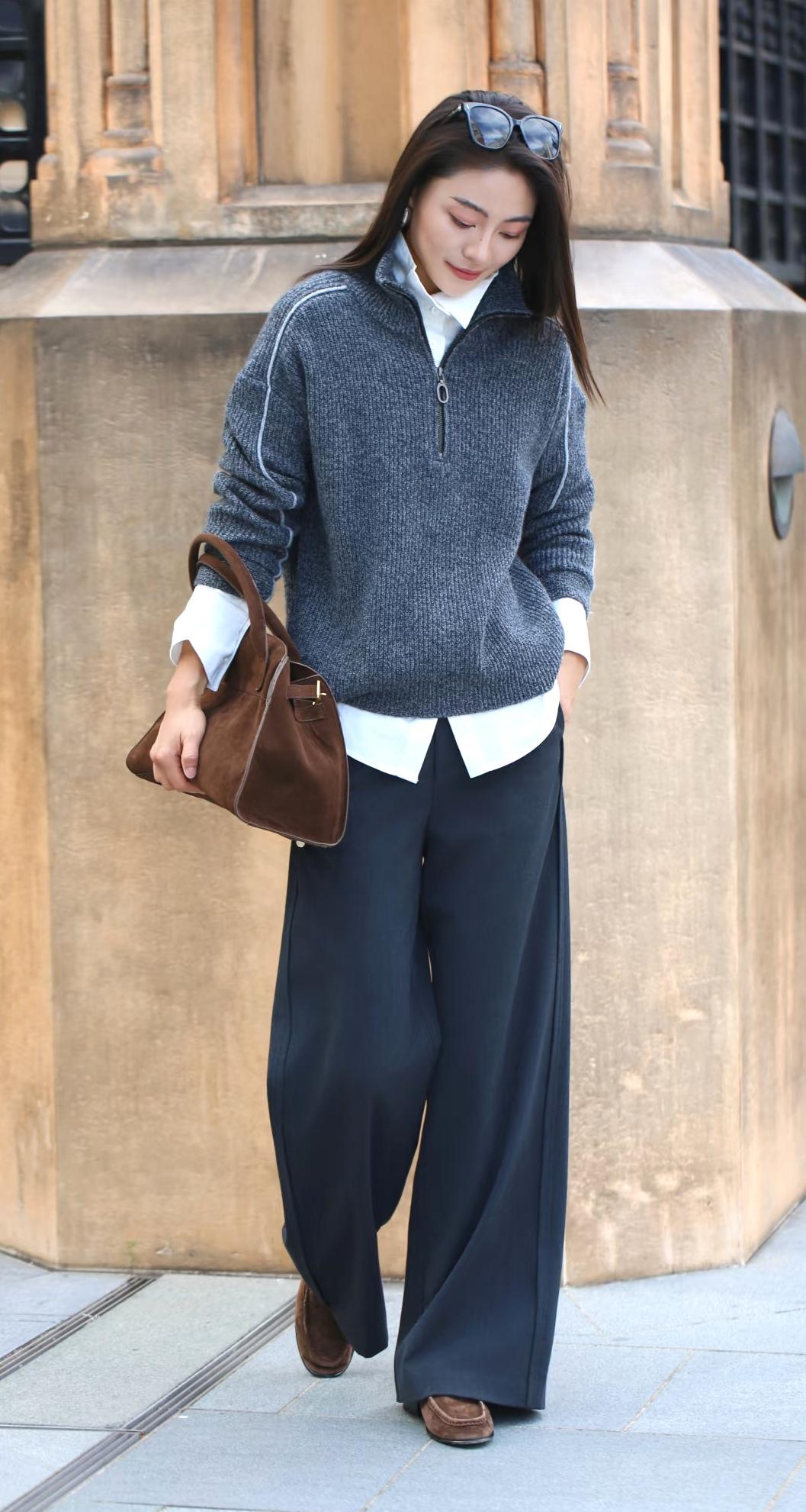四五十岁女性春季选择翻领毛衣穿搭,得体大方又好看,轻松减龄不费力 春天来了,又到了穿毛衣的季节。很多姐妹都习惯穿圆领或高质毛衣,每年都千篇一律,多少显得乏味。 今年不妨试试穿翻领毛衣,会让你收获意想不到的好看效果。因为它能修饰脖颈线条,脖子看上去更修长,脸型也显瘦。 只要选对翻领毛衣版型、颜色、材质,无论身材匀称或偏胖,都能穿出得体大方又好看的造型,时髦减龄不费力。 版型选择:优先选择直筒型、合体微宽松款式 为什么建议选直筒型、微宽松款式,因为这种版型没有腰线设计,包容性强,还有修饰身材比例的视觉效果。适合大多数身材,尤其对腰腹有肉、肩背厚实的姐妹更友好,有一定的遮肉显瘦作用。 微宽松款式,春季温度回升时,单穿松弛不拖沓。早晚寒凉内搭打底衫不会显胖,叠穿外套不显臃肿。单穿叠穿都好看,特别适合春季多变天气。 颜色选择:优选基础色,百搭不挑人 在选择翻领毛衣颜色时,优先选择基础色,如黑色、灰色、米色、雾霾蓝等,这些颜色经典百搭不挑人。无论皮肤白晳或偏黄都适合穿着,搭配不同颜色下装,可以穿出好看不出错造型。 像米色翻领毛衣,内搭黑色高领打底衫,增加保暖和精致感。下装选择灰色西装裤搭配,脚上小白鞋与毛衣形成上下呼应。整体黑白灰配,造型简约高级又显白减龄。 材质选择:优先选择手感柔软细腻毛衣,舒适显质感 翻领毛衣有不同面料,如棒针粗线毛衣、细棉线针织衫、羊毛混纺材质等。建议选择毛线粗细均匀、面料厚薄适中、手感柔软细腻、保暖不闷热的羊毛混纺材质,穿着舒适显精致,看上去显品位,容易穿出气质造型。 避免选择粗毛线织成的翻领毛衣,粗糙又厚重,给人低廉的质感。而毛线过于纤细的棉线针织翻领衫,不够保暖,不适合春季穿着。 四五十岁姐妹选翻领毛衣,只要从这三个方面去选择,就能轻松选到一件满意的毛衣。再搭配衣橱里的直筒裤、牛仔裤、西装裤、半裙等下装,这个春季不用费力就能穿出好看减龄的造型。毛衣减龄穿搭翻领毛衣女新款 春秋减龄毛衣