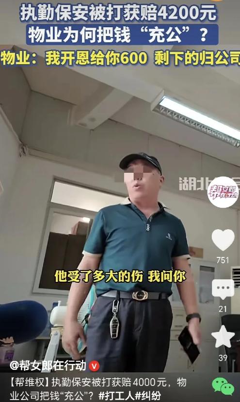 想钱想疯了!湖北武汉,一男子在小区当保安,执勤时被业主打伤,业主赔偿他4200元,男子不会电子支付,委托物业帮他收款,事后,男子到物业要钱,物业经理不给:这是业主赔给物业的钱,我开恩给你600元,剩余的钱充公!结局令人意外! 这件发生在武汉小区的真实事件,看似只是一笔赔偿款的归属纠纷,却赤裸裸地暴露了个别物业管理者利欲熏心、肆意欺压底层员工的不堪嘴脸。 这位五十多岁的保安龚师傅,平日里坚守在小区岗亭,尽职尽责守护小区秩序,靠着这份踏实的工作维持生计,却因小区道闸设备突发故障,被情绪失控的业主无故打伤,手臂当场红肿淤青,不仅身体承受了伤痛,还因此耽误了正常工作。 事发后民警及时介入调解,责任认定清晰明确,业主也自愿达成赔偿协议,其中4000元是赔付给龚师傅的医药费、误工费等人身损害赔偿,200元则是赔偿物业用于维修被砸坏的岗亭玻璃,所有约定都白纸黑字记录在案。 由于龚师傅年纪较大,不熟悉智能手机的电子收款操作,出于对工作单位的基本信任,他在民警和业主的共同见证下,委托物业代为收取这笔4200元赔偿款,本只是简单的代收流程,却成了被克扣钱款的开端。 当龚师傅上门索要自己应得的赔偿时,物业经理的做法彻底让人寒心,不仅无视调解协议的约定,还蛮横地将全部赔偿款划为公司所有,仅拿出600元当作施舍,强行将剩余钱款充公。 这种行为完全无视人身损害赔偿款专属于伤者的法律规定,更是看准了老保安老实本分、不懂维权,妄图明目张胆地侵占他人用伤痛换来的赔偿款。 好在后续媒体与执法部门介入调查,在确凿的事实和法律依据面前,物业才不得不退还扣除合理费用后的剩余款项,龚师傅最终拿回了属于自己的赔偿。 可金钱虽能追回,物业的做法却深深伤了劳动者的心,一个因公受伤的基层保安,本该得到单位的关怀与维护,却遭到自家物业的趁火打劫,这份贪婪与冷漠,远比肢体上的伤痛更让人难以接受。 这件事也警醒着所有人,职场中最不该消耗的就是员工的信任,最不该欺负的就是老实本分的劳动者。 个别管理者把心思用在侵占底层员工权益上,不仅失了道德底线,也触碰了法律红线,最终只会失去人心,自食恶果。 大家对此怎么看?欢迎评论区留下您的观点!
