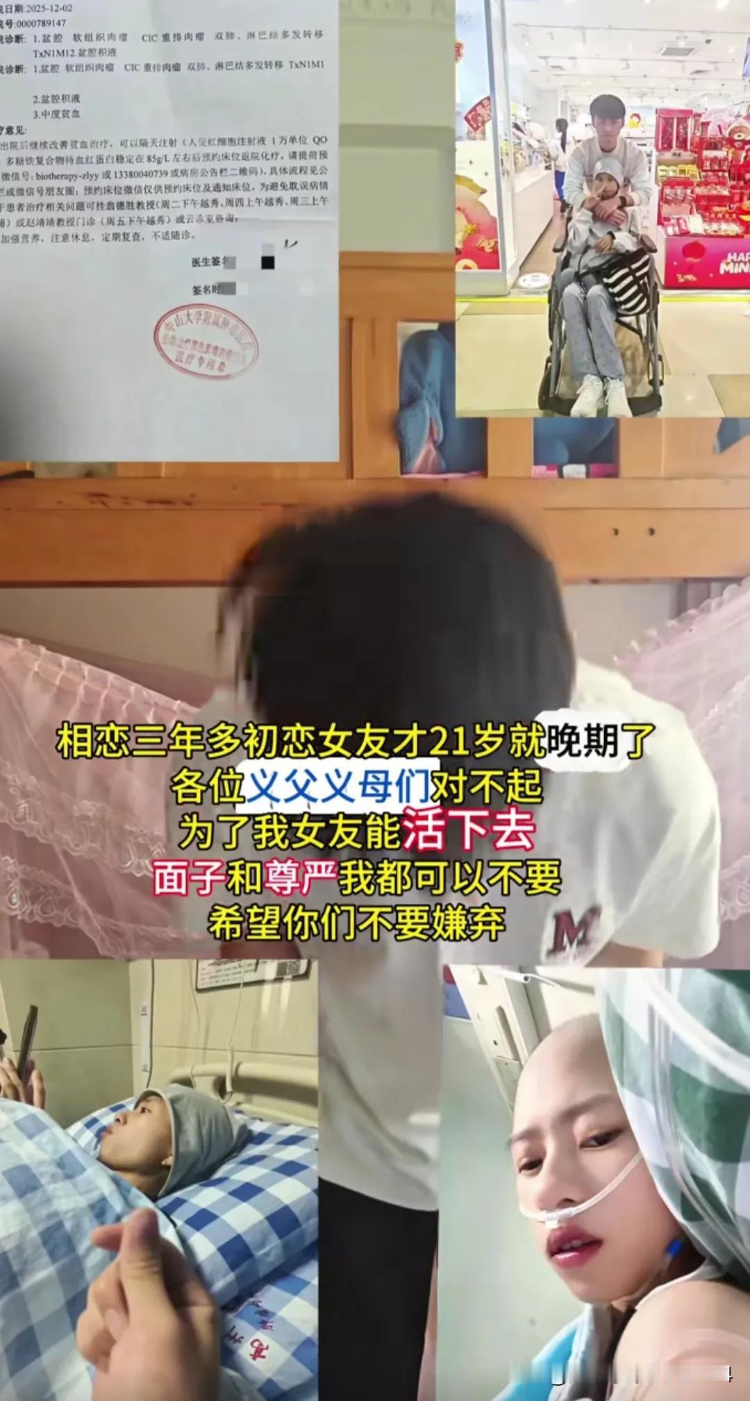 “这就是最初的爱情吧!”广东茂名,大年初四晚上11点多,一位21岁的男孩为了给女友赚医药费,向网友下跪、自荐做游戏代打。可两天后,其女友还是没抢救过来,生命永远停留在了21岁。网友:生命中最初最美好的一段时光,深深刻在了心上 两人是大学同学,相识于2020年夏天的那场军训。两年后两人相知相恋了,可命运似乎总爱开玩笑,去年9月份才20岁的女友因右下腹剧痛就医,竟被告知确诊是癌症晚期! 还是非常罕见的“CC重排肉瘤”,因肿瘤较大、附着神经一时很难手术,仅能化疗。两人像听到了晴天霹雳, 彼此都只有20岁,刚刚走入社会实习,美好生活才开始呀!两人谁都没有放弃希望,男孩全程陪同女孩往返北京、上海求医;女孩则咬着牙,一次次地化疗,一次次地向男友微笑着说“没关系,没有那么痛了!” 自从女孩确诊癌症晚期后,男孩从来都是挺直的脊背似乎一夜之间就塌了。父母知道后、劝他放弃,可他实在不忍心,3个月后,两个年轻人最后一点积蓄也耗没了。 在抖音,男孩放弃了所有的尊严,向网友下跪说明了女友情况,断断续续筹了1万多。 就这样,男孩一边工作、找各种兼职赚钱,一边照顾女友寻求希望。可上天似乎看不得这么美好的爱情, 在大年初六清晨,女孩还是走了。拿着刚为女友买下的,她心心念念的手机,男孩哭了,这是部二手手机。 最后时刻,男孩回忆“从知道病情起从未想过分开”,悼词中他写下了此生最想说的话“我的女孩停在了最好的年纪,也永远留在我心里。” 知道女孩去世后,有网友说,那个年纪没那么多权衡利弊!相信爱情的年纪,也是一种幸福。 还有网友说,怎么年纪轻轻的上来就是晚期呢? 又有网友说,女的美,男的帅还专一,世间少有了!有情人却成不了眷属,问苍天,你为什么要这样无情[流泪] 问世间情为何物?直教人人向往,却又难得全乎!天南地北大拜年 (信息源:晨视频)