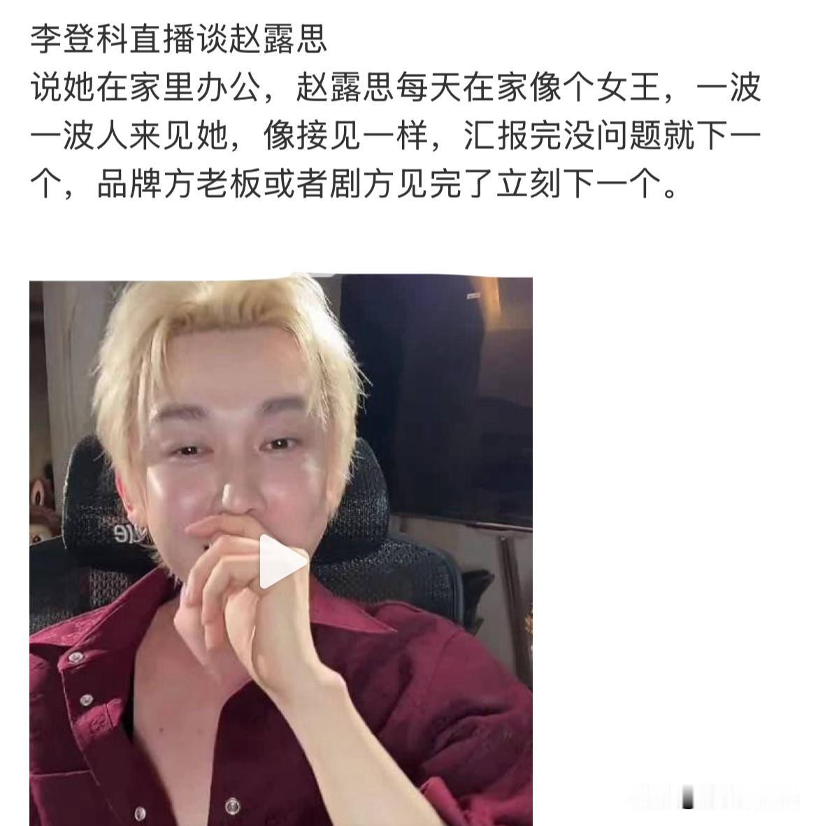 2月25日,古力娜扎前经纪人李登科捧夸赵露思,说赵露思天天居家办公像个女王一样接见剧方及品牌方,他说的不尴尬,网友听的都尴尬了,如果不知道赵露思签了公司,不是个人工作室,自主话语权我就信了 目前赵露思相比艺人更像大网红,没有作品支持,靠舆论撑了一年的热度,还能撑第二年么?对于这个问题,许多人都头顶问号,目前看赵露思热度在逐渐缩小,内娱一旦有新的女流量起来,赵露思很快就会被剧方品牌方迭代,维持热度是赵露思目前的主要工作,李登科这波助力了赵露思! 内娱无利不起早,无风也起浪,感觉两人后续会有合作!李登科不是一个会猛夸赵露思的人!