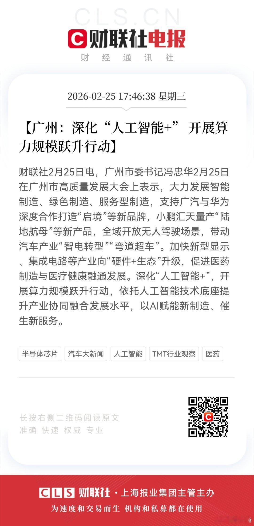 【广州:深化“人工智能+” 开展算力规模跃升行动】财联社2月25日电,广州市委书记冯忠华2月25日在广州市高质量发展大会上表示,大力发展智能制造、绿色制造、服务型制造,支持广汽与华为深度合作打造“启境”等新品牌,小鹏汇天量产“陆地航母”等新产品,全域开放无人驾驶场景,带动汽车产业“智电转型”“弯道超车”。加快新型显示、集成电路等产业向“硬件+生态”升级,促进医药制造与医疗健康融通发展。深化“人工智能+”,开展算力规模跃升行动,依托人工智能技术底座提升产业协同融合发展水平,以AI赋能新制造、催生新服务。