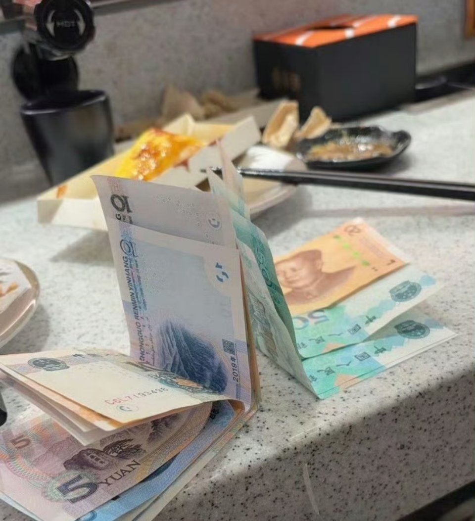 一顿饭付了63张五块钱我们一群人去吃宵夜,吃完了让老板等一下然后都掏出红包在那拆