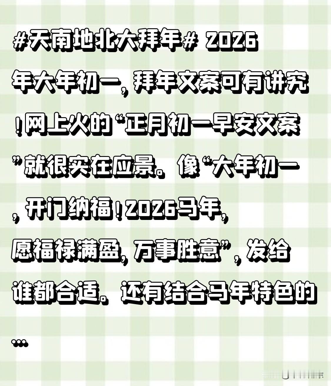 2026年大年初一,拜年文案可有讲究!网上火的“正月初一早安文案”就很实在应景。像“大年初一,开门纳福!2026马年,愿福禄满盈,万事胜意”,发给谁都合适。还有结合马年特色的“祝君龙马精神身体健,一马当先事业兴”,既应景又有文化。拜年就图个心意,这样接地气的文案,谁能不爱呢!