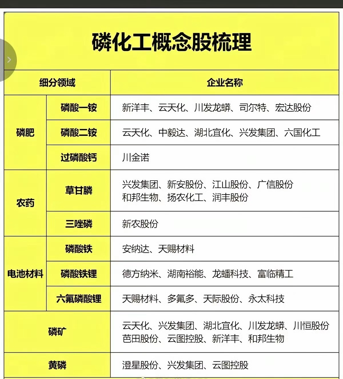 化工细分领域大全:磷化工:云天化、川金诺、川发龙蟒、和邦生物、金正大、澄星股份、