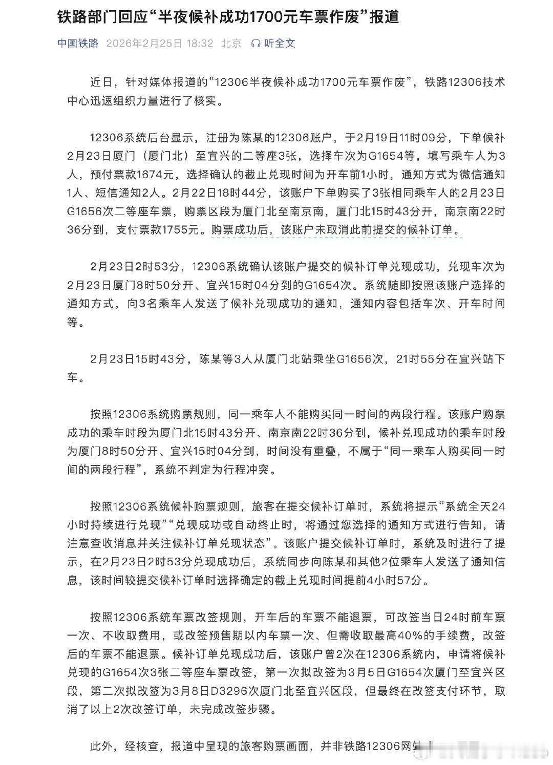 【铁路部门回应1700元车票作废】2月25日,据中国铁路公众号:近日,针对媒体报道的“12306半夜候补成功1700元车票作废”,铁路12306技术中心迅速组织力量进行了核实。