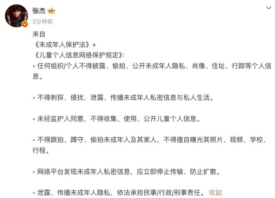 张杰声援谢娜看到娜姐的发声真的很有感触。每个人都享有隐私权,请尊重他人隐私。明星子女也是孩子,他们的童年不该被镜头打扰,保护未成年人隐私,从尊重开始。