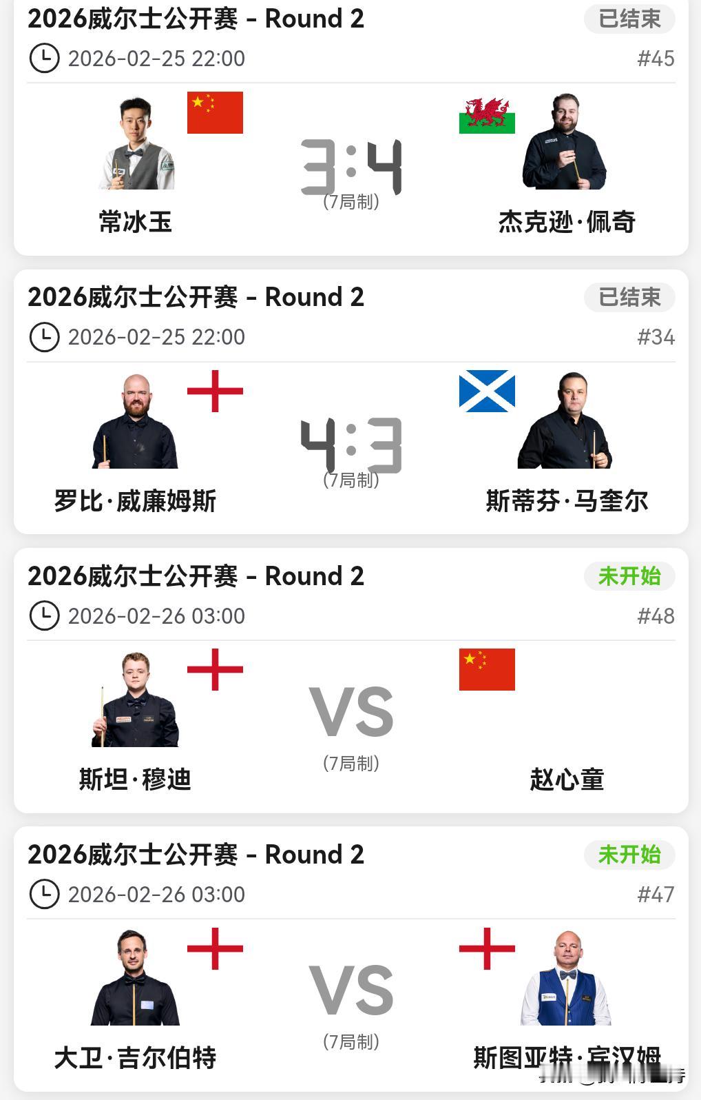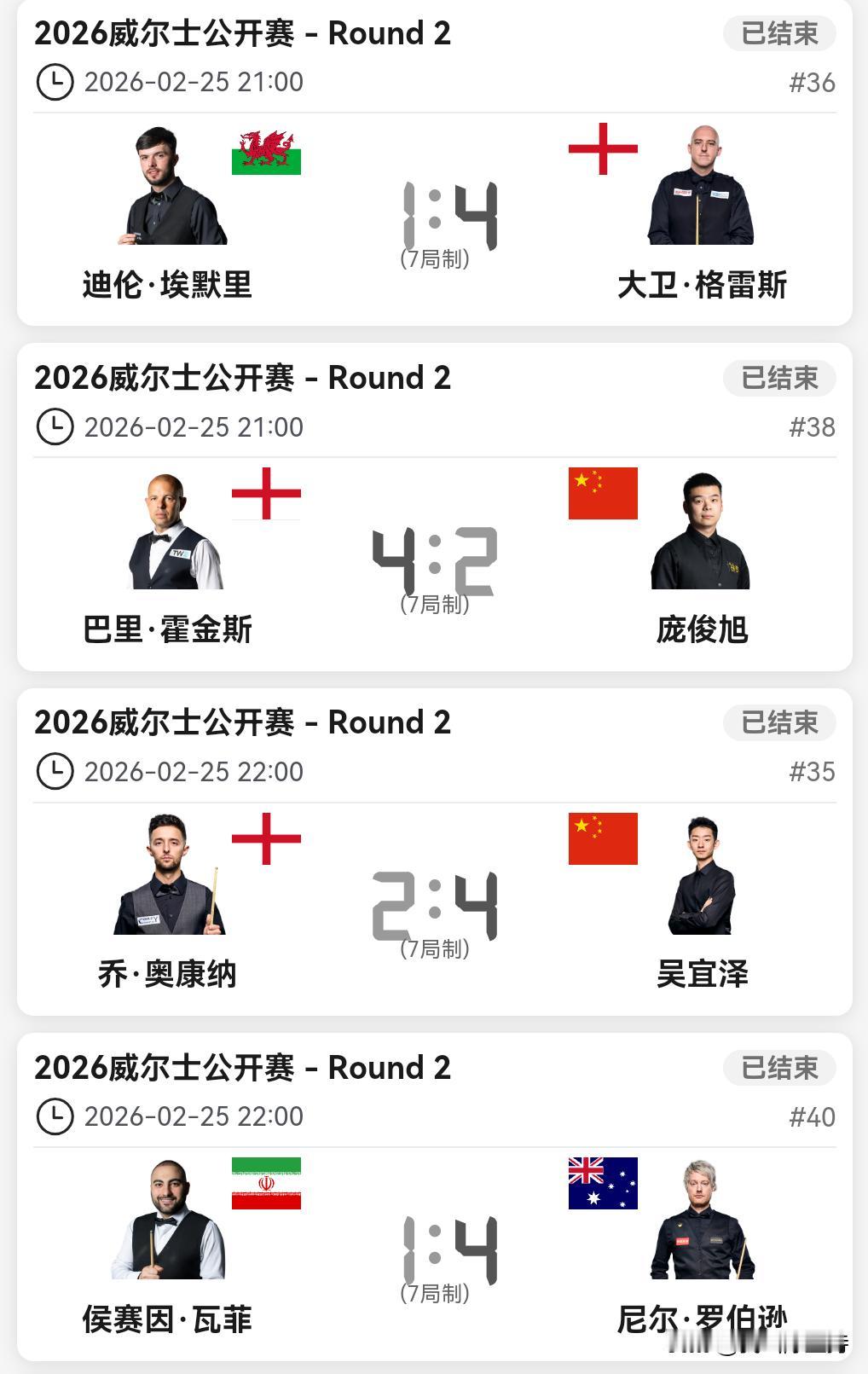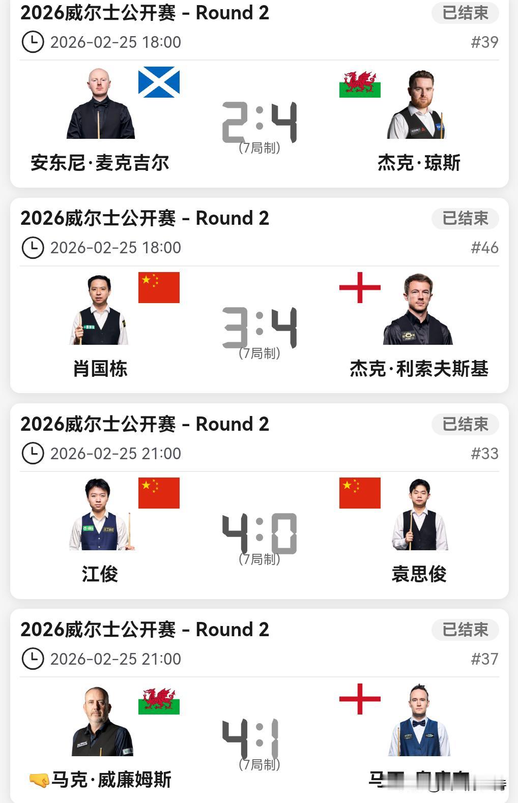 威尔士公开赛32进16,吴宜泽、江俊晋级,肖国栋、常冰玉、庞俊旭、袁思俊被淘汰。