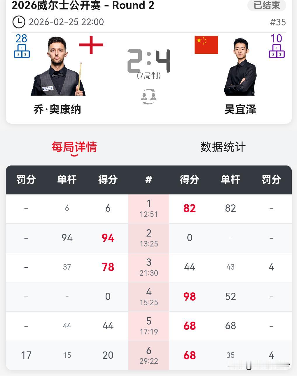 威尔士公开赛32进16,吴宜泽、江俊晋级,肖国栋、常冰玉、庞俊旭、袁思俊被淘汰。 吴宜泽展示了一个优秀球员的素质,面对强大的对手,在1-2的不利局面,还被判罚犯规,依然能够稳定的输出,4-2击败奥康纳。 吴宜泽长台精准,相对放松。前几局K球运气不好,但是心态平稳,最终战胜对手。 吴宜泽下一个对手是大卫格蕾丝。 常冰玉和昨天连续4杆过百击败墨菲相比,有云泥之别。佩奇在长台、安全球等方面不落下风,双方争夺到最后一局。常冰玉长台不进,对手一杆超分,3-4落败。虽然离开了威尔士的舞台,但是常冰玉昨天的高光时刻还是会载入史册。 常冰玉如何能长时间保持状态要研究一下。 击败塞尔比的江俊,继续摩擦前行。4-0战胜袁思俊,这样的比分还是有点意外。江俊下一个对手是罗比威廉姆斯。 凌晨三点,赵心童对阵穆迪,张安达对阵普伦。