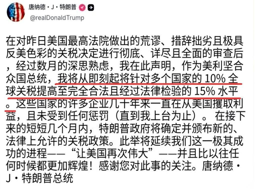 特朗普又把那根“关税大棒”抄起来了。 行政令签下去,先加10%,话音刚落,他手一挥,不对,得加到15%,三天后就办。 结果,全世界的电话线,这次出奇地安静。 换作几年前,抗议声明能把白宫的邮箱塞爆。可这回,欧盟的电话打不通,日韩的传真机没动静,我们这边,就回了三个字:知道了。 怪了?一点不怪。 就在几天前,美国最高法院刚当着全世界的面,把他之前那套“国家紧急状态”的玩法给否了,直接说:总统先生,你没这个权力。 那份判决书的墨迹还没干透,特朗普就从一堆几十年前的老旧法条里,扒拉出个新借口,重新签了这份加税令。 动作很快,姿势很凶。 但牌桌上的其他人,这次连眼皮都懒得抬。 布鲁塞尔那边,官员们只是把一份刚谈好的协议批准程序按了暂停,日程表上,德国总理几个礼拜后去华盛顿的行程,照旧。潜台词很清楚:你先闹,我们按流程走,不陪你玩心跳。 东京更有意思。电视上,有政客痛斥他“毫无道理”,镜头一转,几千亿的投资款,第一笔已经打过去了。办公室里,骂他的报告和夸他的合作计划书,就摆在同一个文件筐里。 首尔那边干脆把算盘端了出来,贸易部长对着镜头直接摊牌:未来靠不住了,我们得赶紧多找几个码头,鸡蛋不能放一个篮子里。 这一圈看下来,大家好像都拿到了同一份剧本:他演他的,我们忙我们的。 为什么?因为“狼来了”的故事,听了太多遍,村里人连窗户都懒得开了。 更关键的是,他这次签的行政令,上面印着“保质期”:150天。所有人手里都等于捏了一张“再等等看”的牌,没人急着第一时间就掀桌子。 最要命的一招,是美国最高法院自己递出来的。它等于给全世界直播了一场表演,告诉所有人:别怕,这人脖子上拴着链子,家里还有人能管着他。 大家一看,你家里自己人还在斗法,我们这些外人,何必冲上去当第一波炮灰? 所以你看,他以为自己是在舞台中央挥舞指挥棒,想让全世界跟着他的节奏跳。 结果一回头才发现,台下的观众,早就换台了。