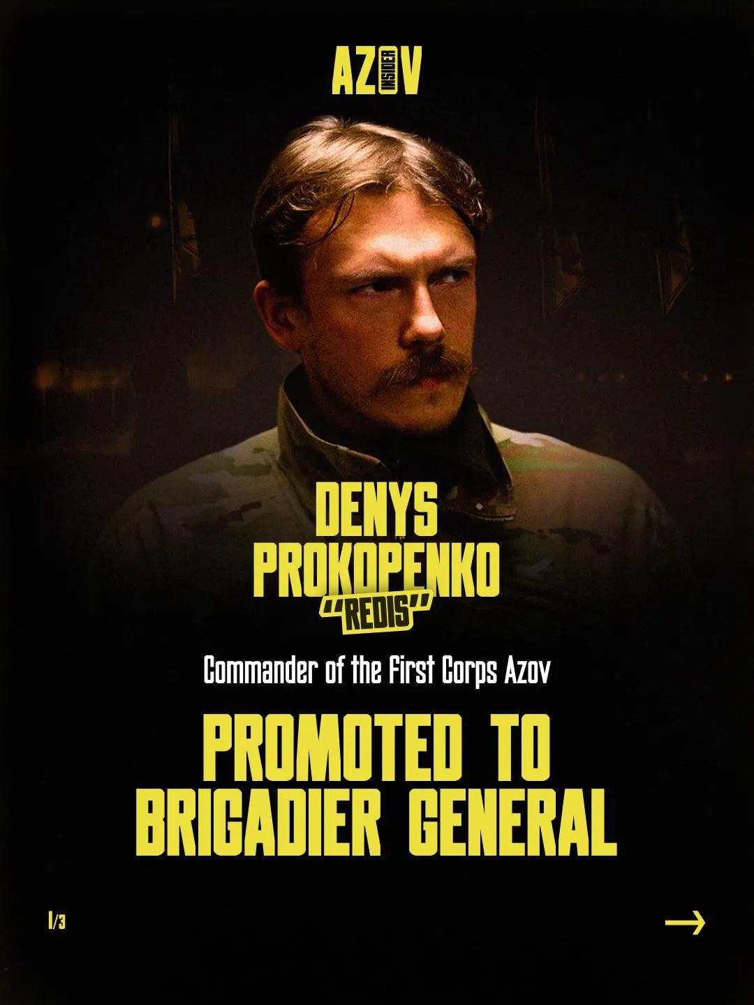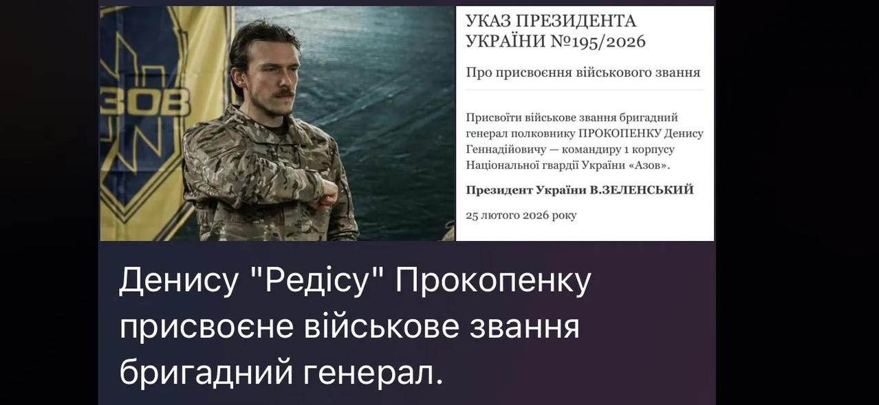 乌克兰总统授予国民警卫第一军亚速军团司令,丹尼斯.普罗科彭科(代号"雷迪斯")准将军衔。 目前第一军主力在波克罗夫北部作战。 乌军方司令 乌总统授勋