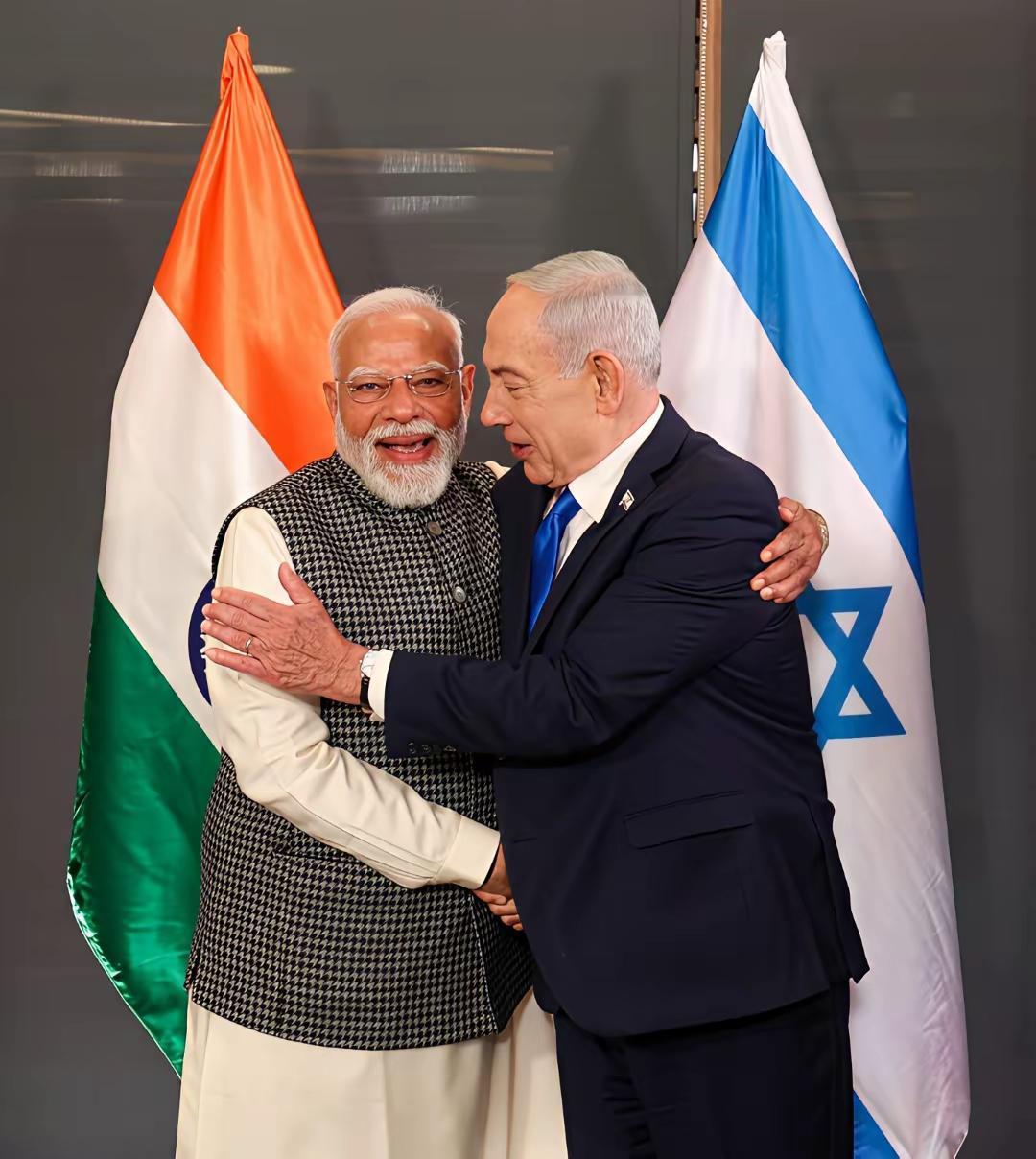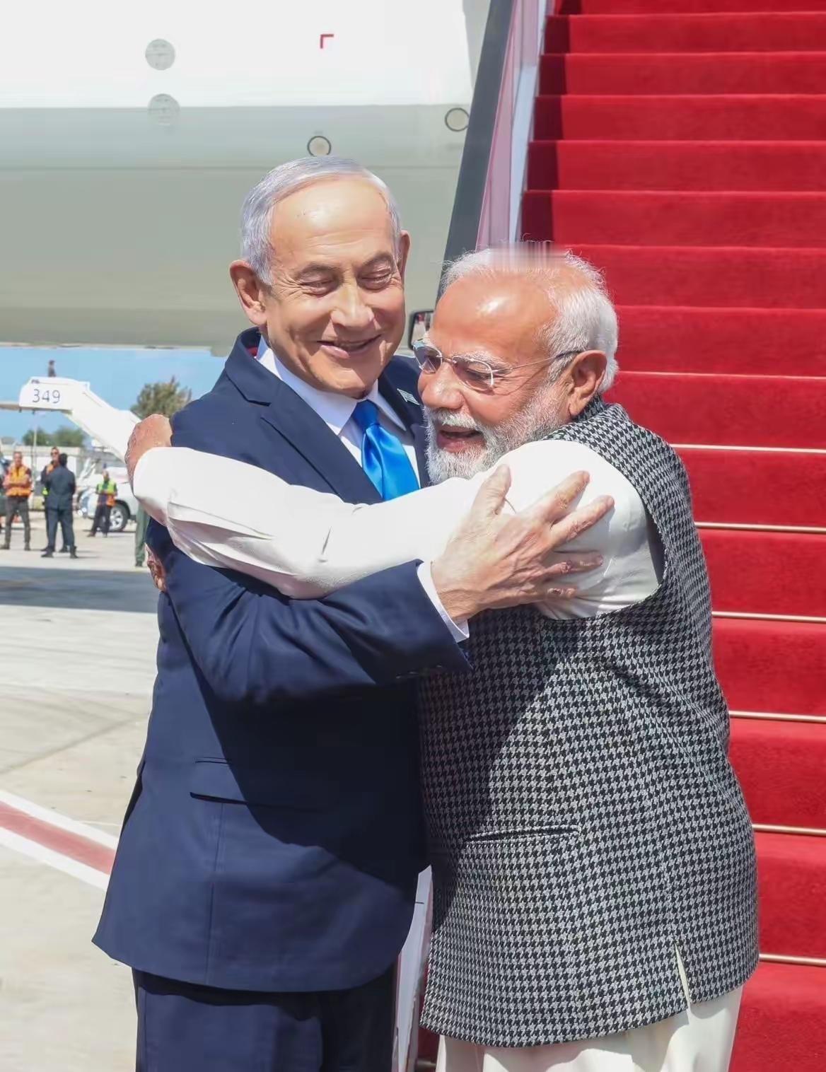 莫迪和内塔尼亚胡这一抱像极了多年未见的老友一般,但怎么看俩人都像各自心怀鬼胎。 莫大仙心里一定在想: 别人怕我忽悠都躲我躲的远远的,你老胡竟然主动请我上门,看来我不把你从中东第一发达国家坑成第三世界国家都对不起我大仙的名号。 内塔尼亚胡心里一定暗自庆幸: 我现在信誉差,别人都不愿意和我做生意了,你这冤大头来的刚好!