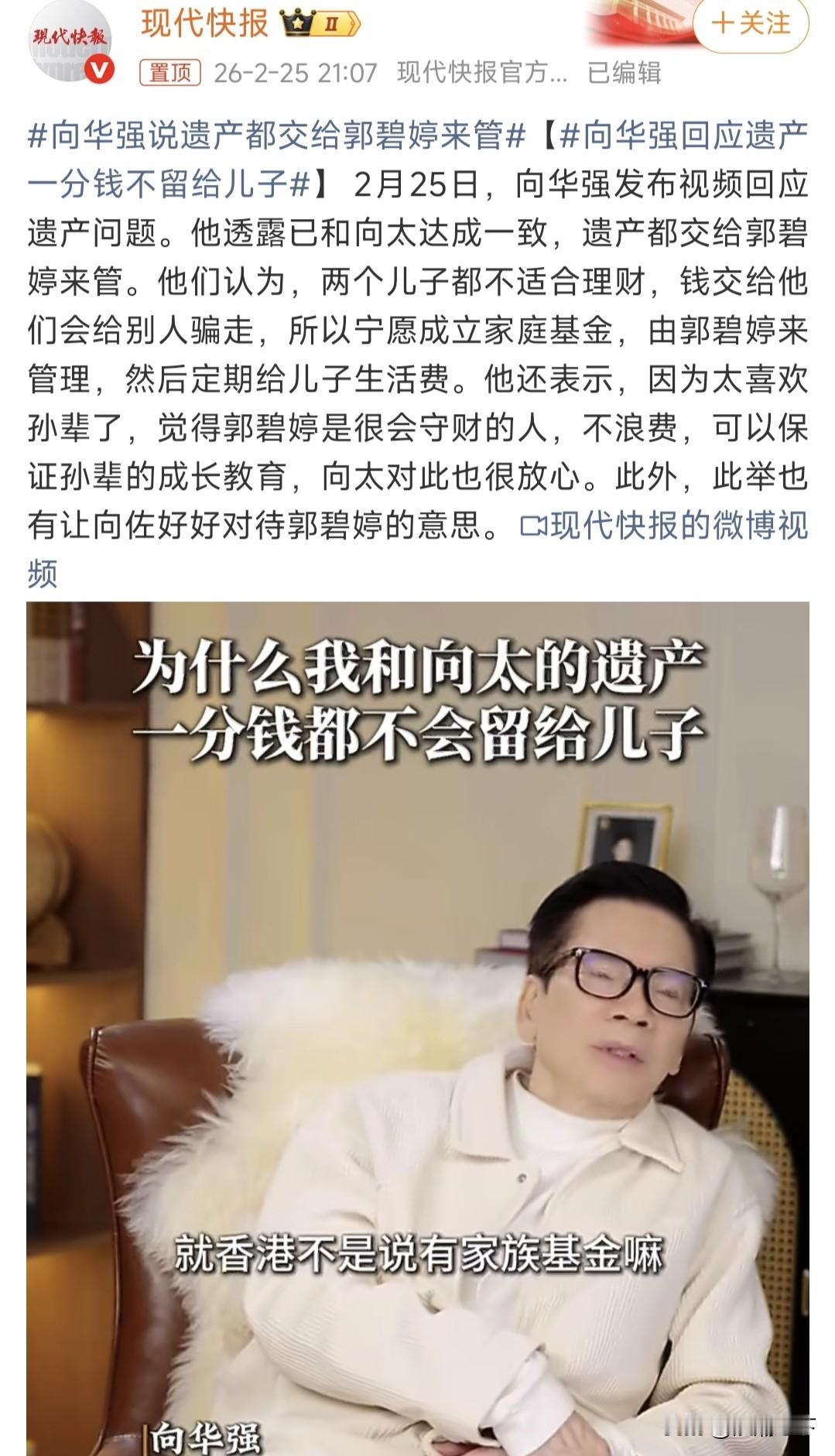 郭碧婷如果是他俩的女儿,感觉他们看不上任何男人够格娶走自己女儿,实在太爱郭碧婷了[赞]给碧婷管,会是留给孙子孙女~留给俩儿子,毛都不会剩的! 郭碧婷才是亲女儿吧[泪奔],话说俩人都很精明,怎么儿子就没遗传呢?给郭碧婷管理又不是所有钱都给郭碧婷,俩儿子也能领到钱。而且俩儿子啥样他们自己心里明白,郭碧婷来管理起码能守住、能花到孙辈身上,他俩儿子管可能啥也剩不下! 郭被推到风口浪尖[笑哭]。这个家要不是没有郭就不能在这个圈混了。 因为清楚儿子是赌棍,掌管家产,那就是赌赌赌离婚再婚……最后人财两空!
