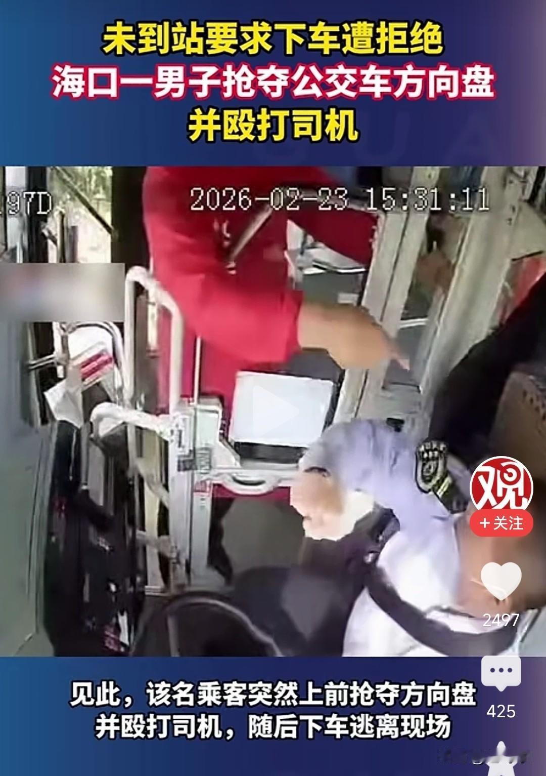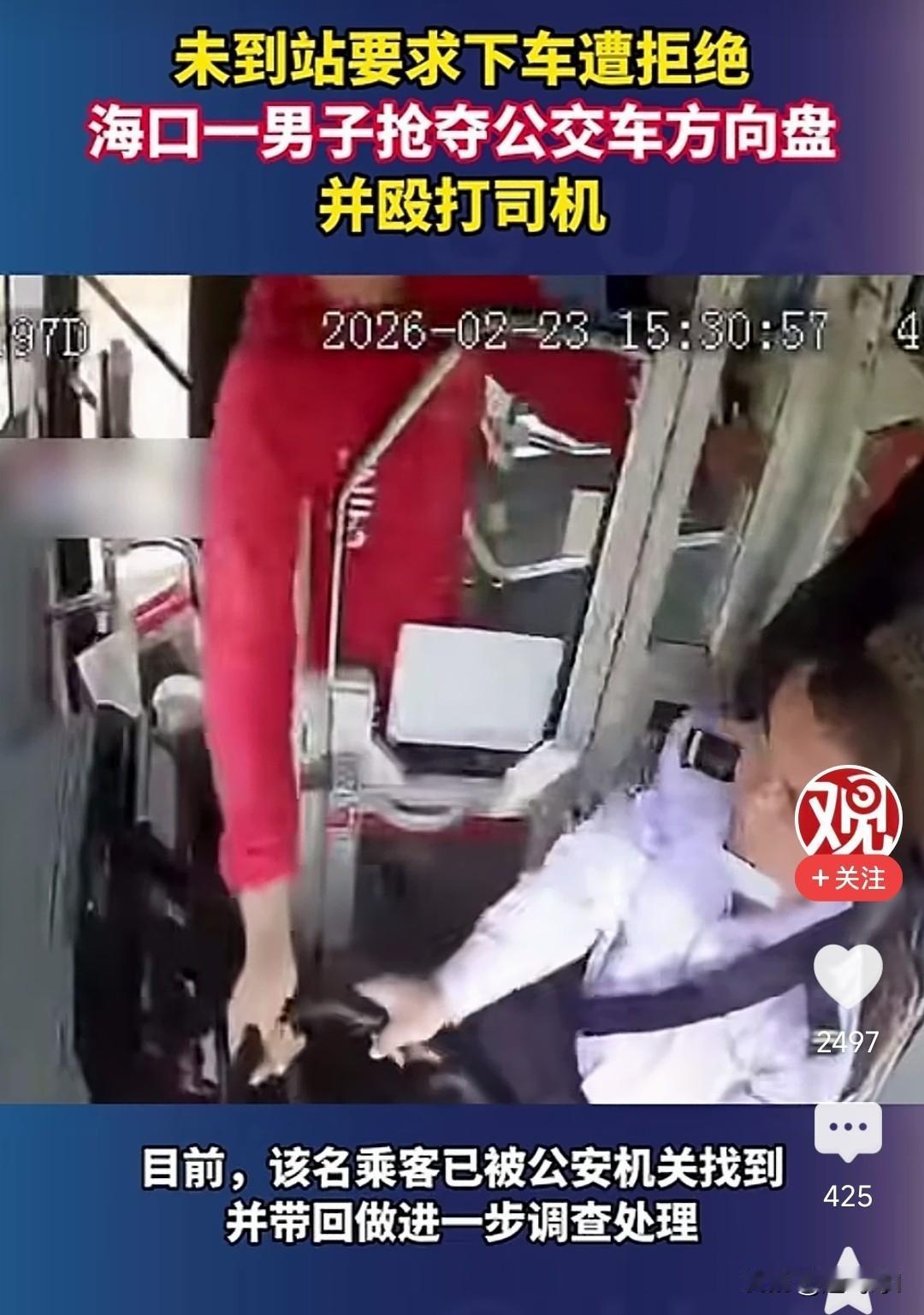 2月23号下午在海南海口发生一男子未到站抢公交车方向盘,还动手打公交车司机,影响公交车正常行驶,不顾全车乘客生命安全。 该乘客被公安机关找到并带回调查,该男子行为已经构成犯罪,接下来等他的是终生后悔,愚蠢的人才能干这愚蠢的事。 全国已经有几起这样典型案例,都是三年以上刑期,海口这个男子他已经上榜了,公交车在行驶中谁抢方向盘谁就去吃牢饭,打砸方向盘影响公交车司机正常行驶的都要受法律制裁。 公交车是载人的,上面有乘客,绝不能影响公交车司机正常驾驶,公交车是公共场合,安全第一,乘车舒心环境靠大家保护,影响驾乘安全的都受到唾弃。