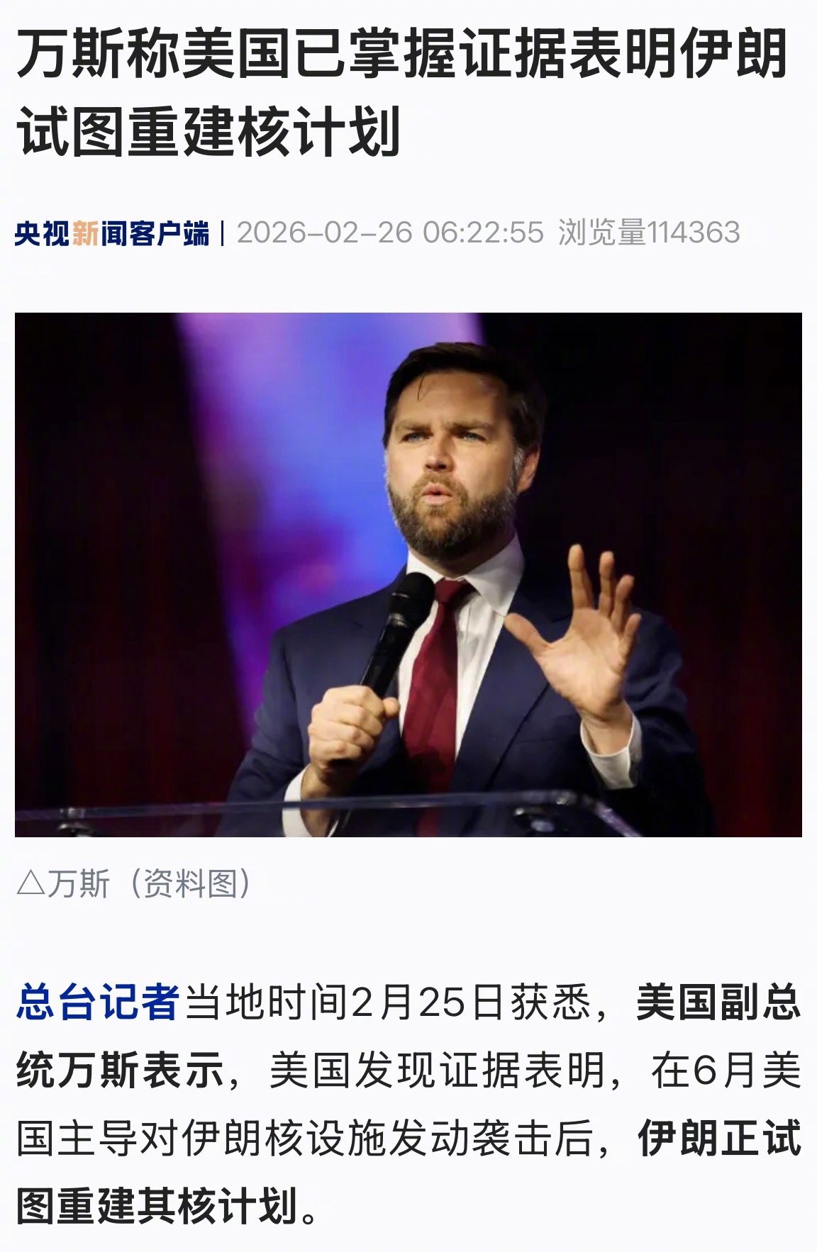 【万斯称美国已掌握证据表明伊朗试图重建核计划】总台记者当地时间2月25日获悉,美国副总统万斯表示,美国发现证据表明,在6月美国主导对伊朗核设施发动袭击后,伊朗正试图重建其核计划。