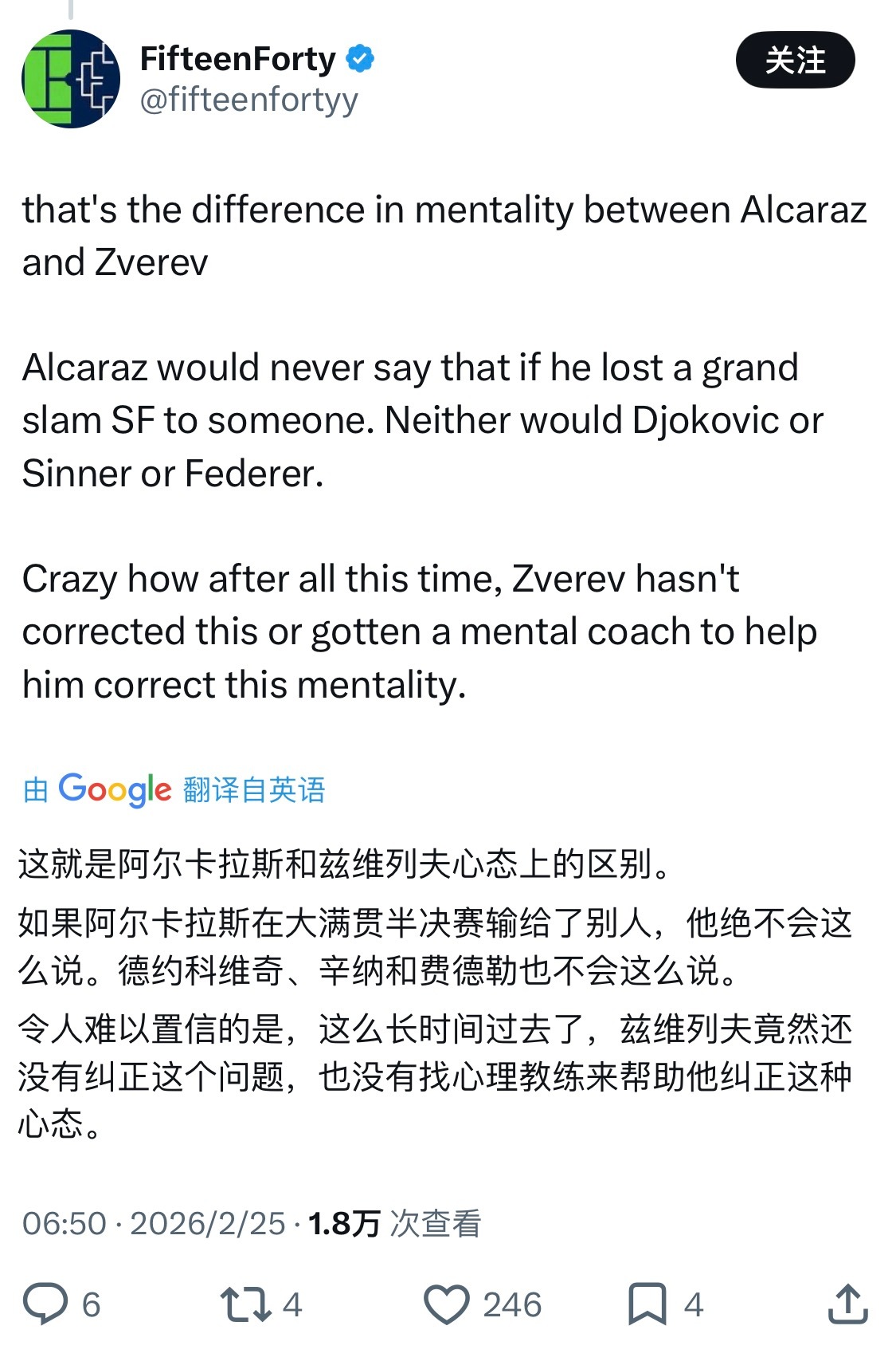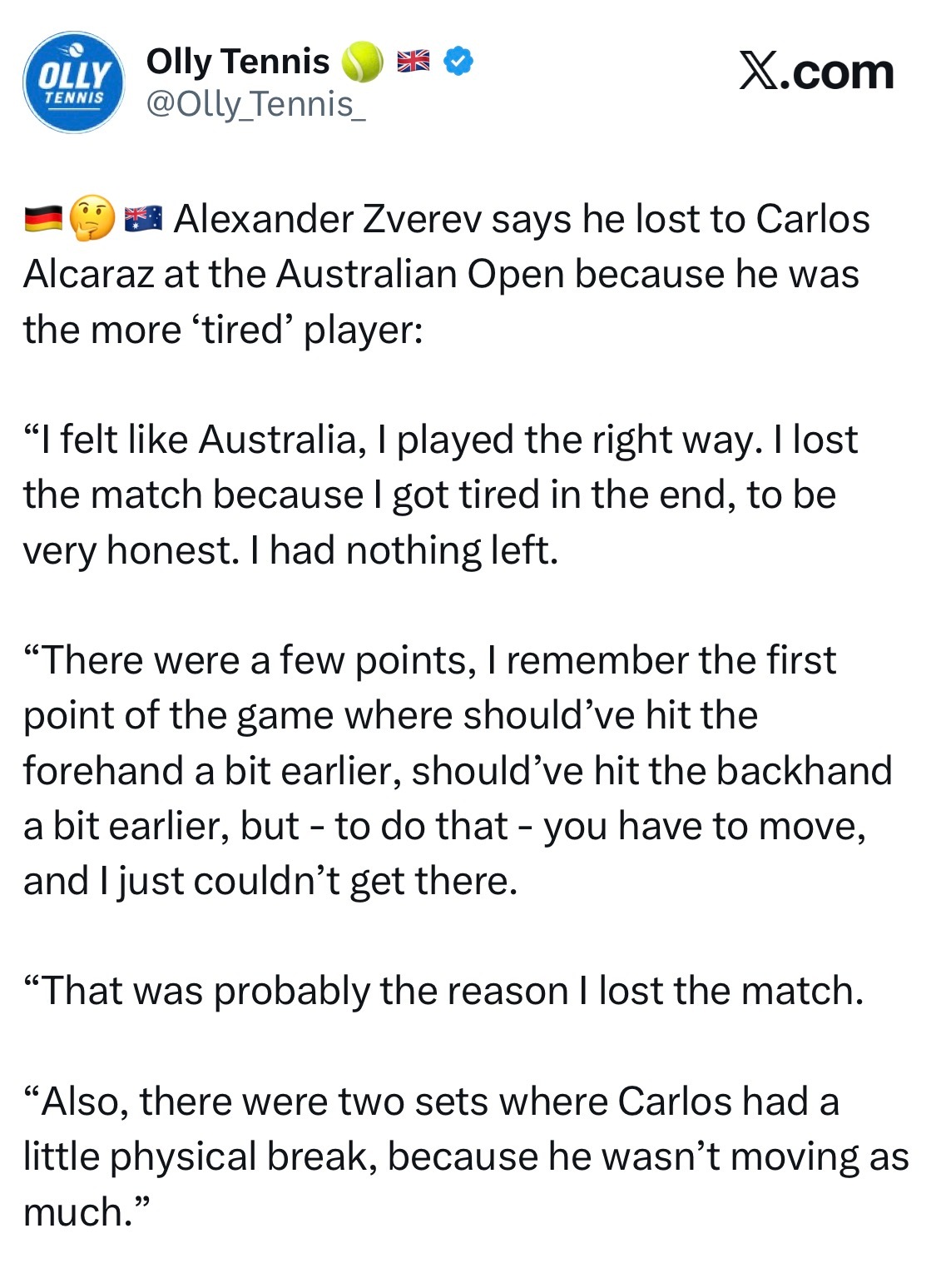 阿卡普尔科500赛,兹维列夫澳网后首次参赛,对那场耗时五个半小时的半决赛失利进行了复盘。他是这样总结自己的败因的: