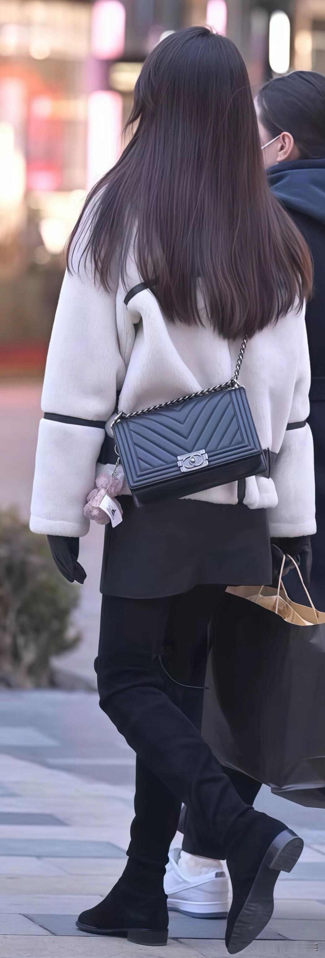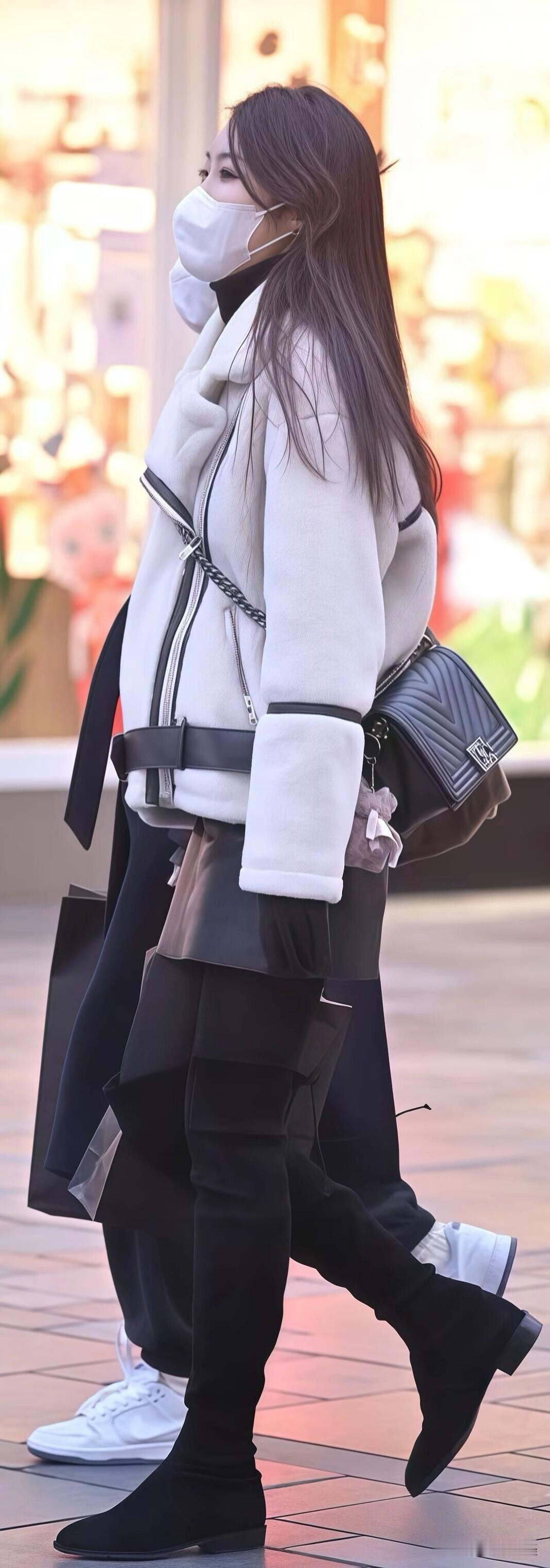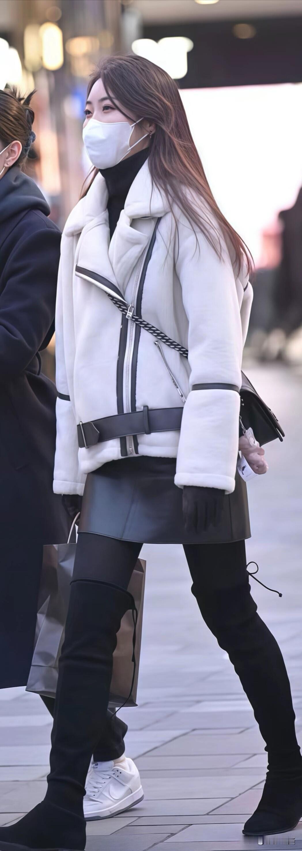 米白色羊羔毛外套配黑色皮裙,搭过膝长靴利落显瘦。冬日经典黑白配,保暖又好看,出门照搬就行。