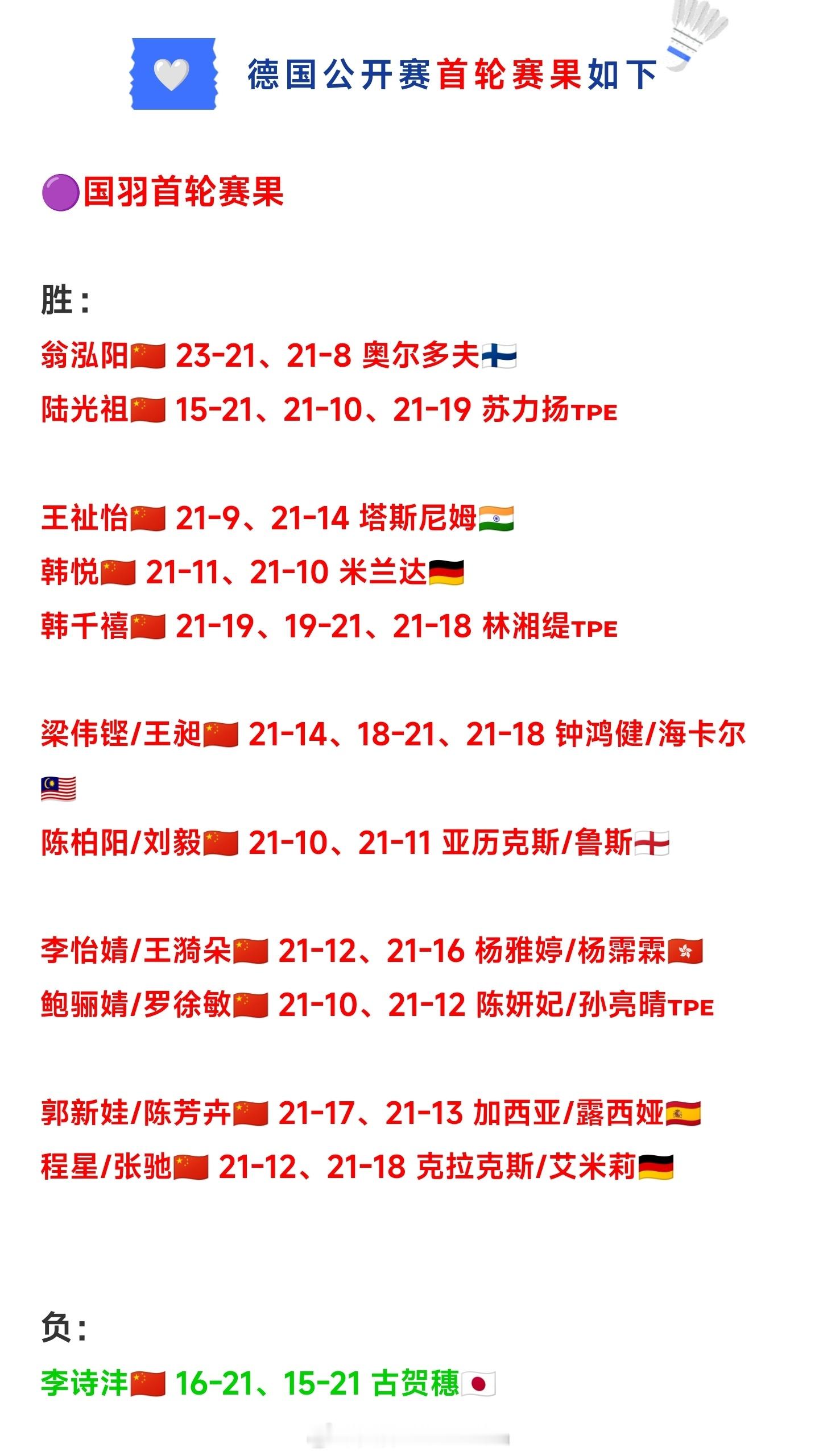 德国🇩🇪羽毛球公开赛国羽首轮11胜1负