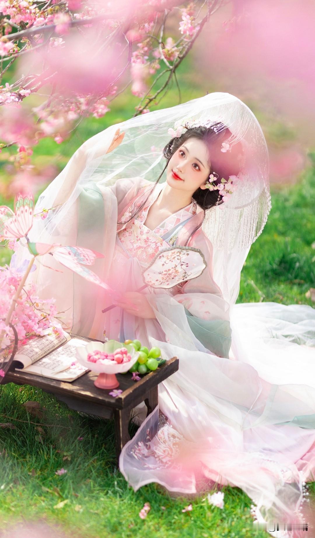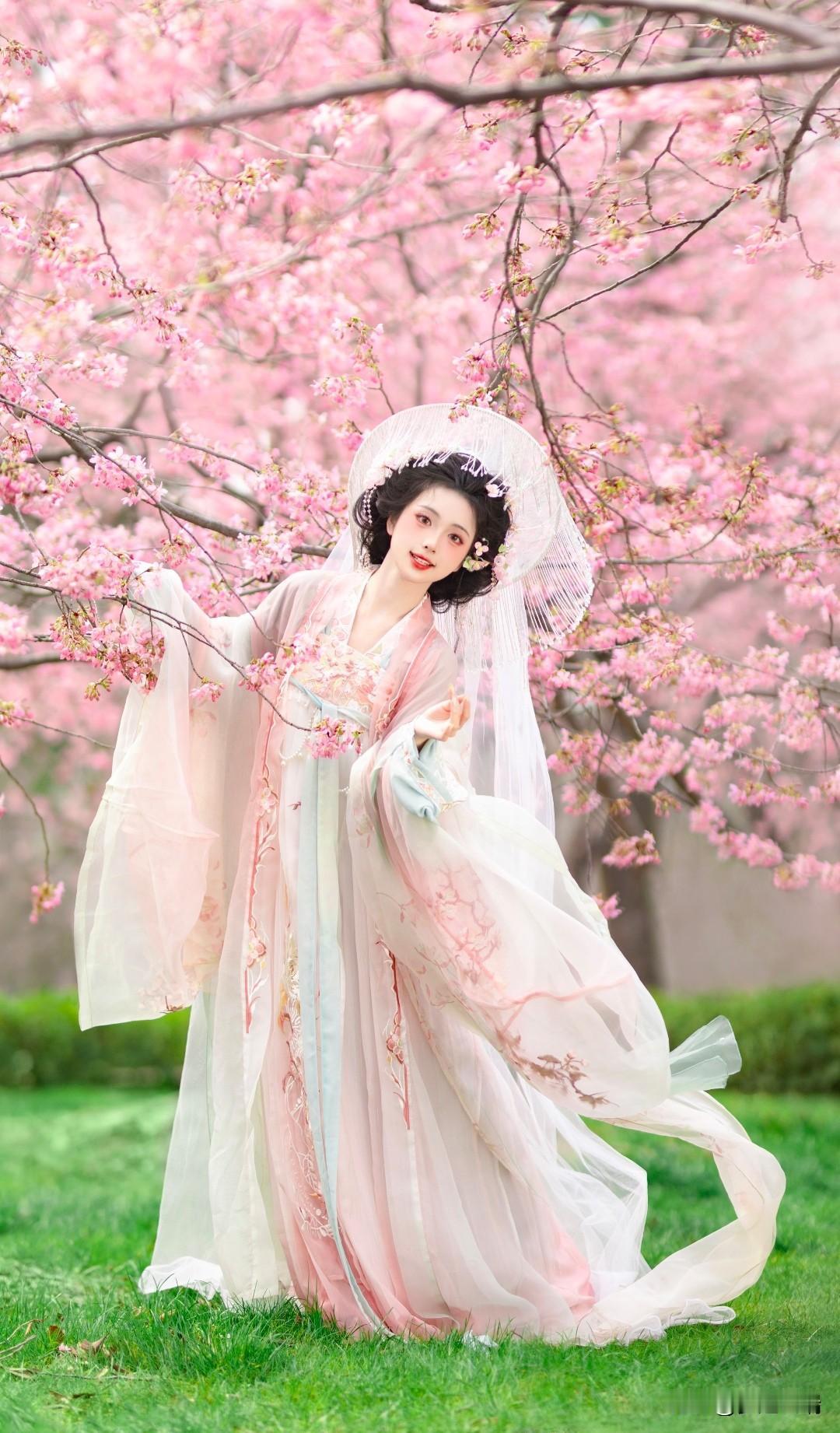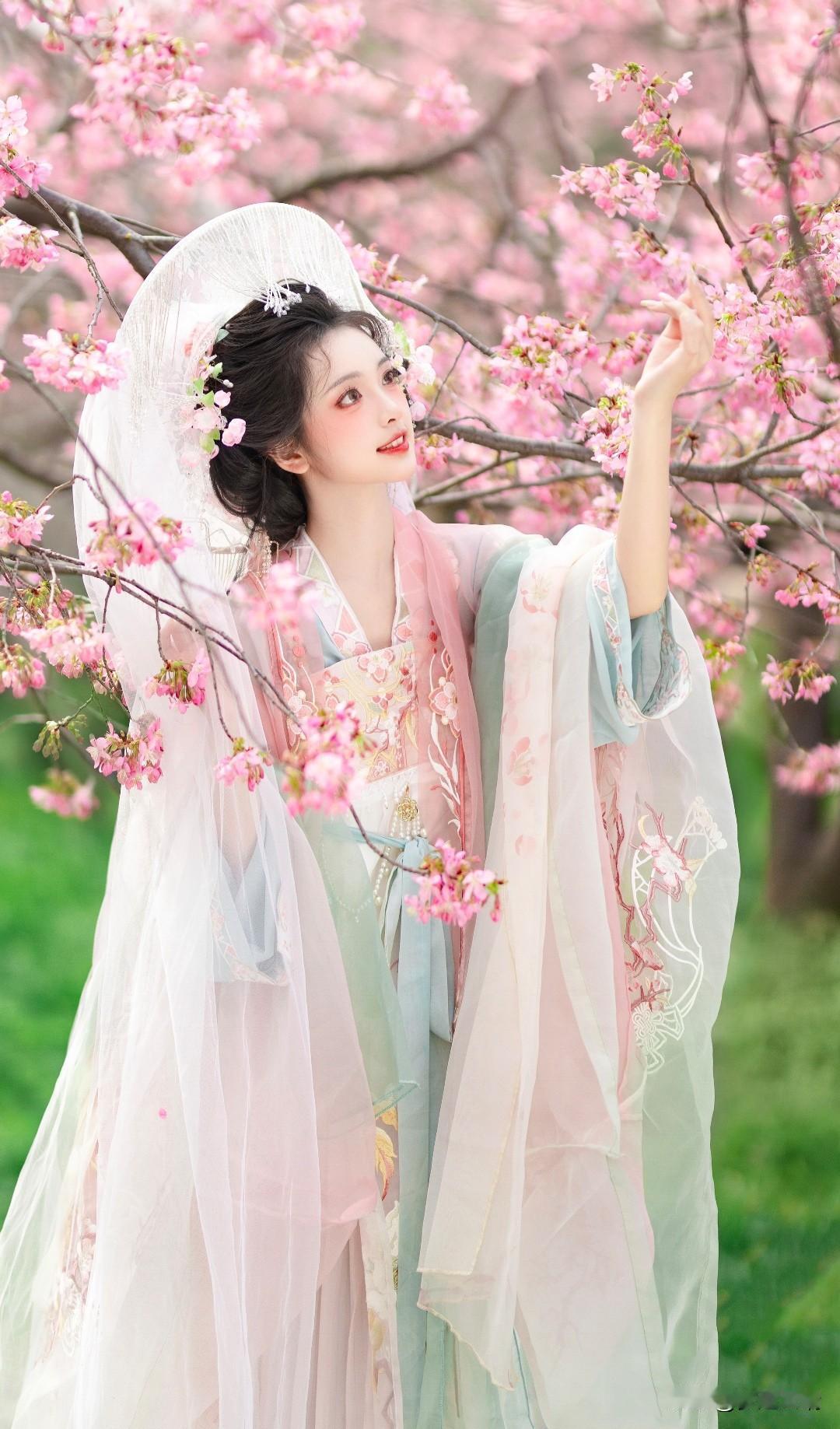 樱花树下,古风美人轻抚花瓣,如梦似幻。