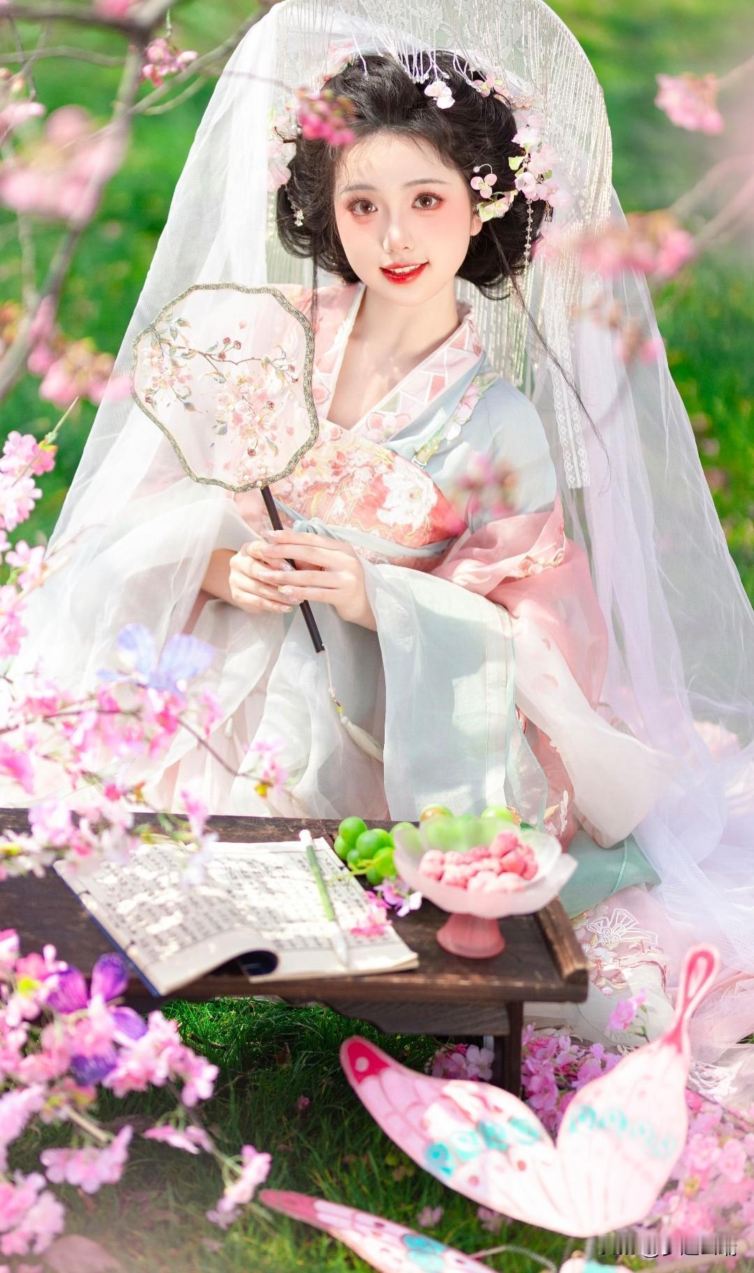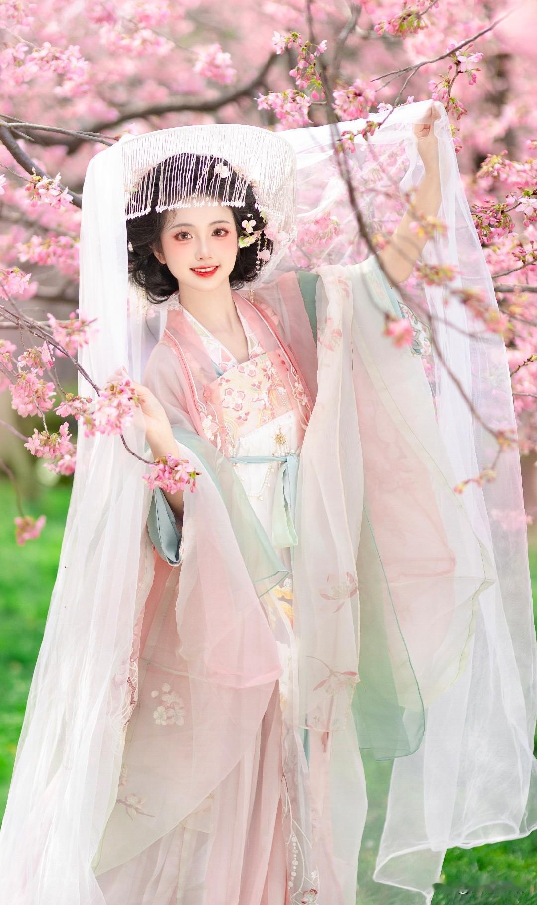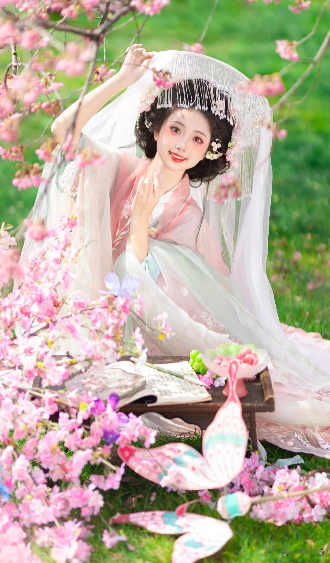 樱花树下,古风美人轻抚花瓣,如梦似幻。