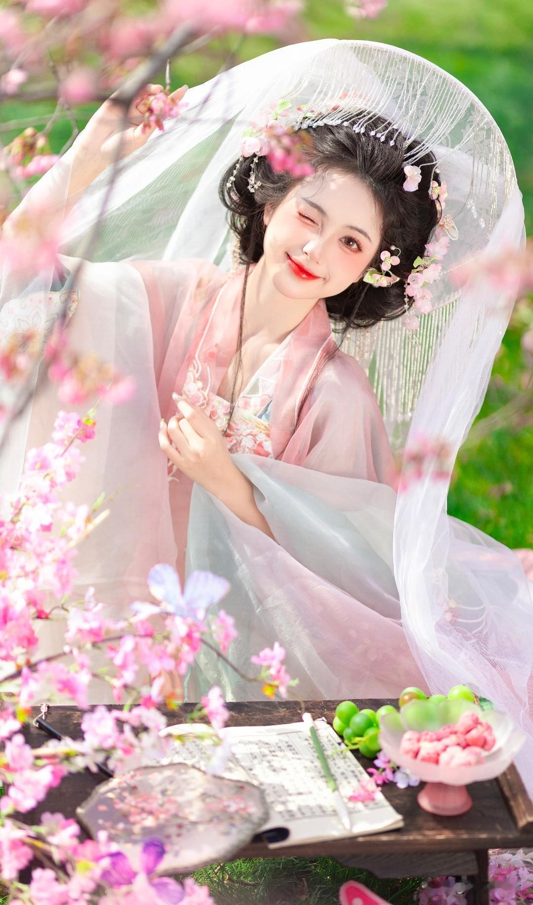 粉衣美人立花间,春意盎然入画来。
