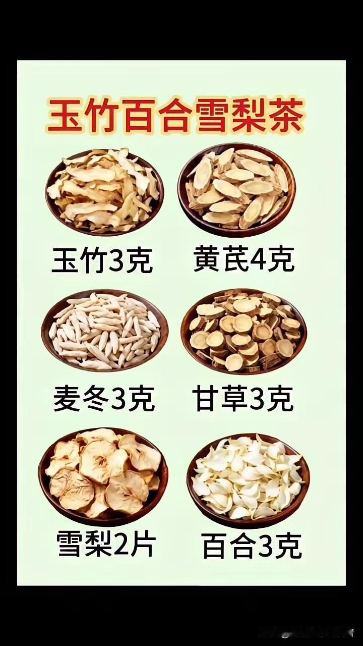 玉竹百合雪梨茶:温润养肺,秋冬润燥佳饮 这款玉竹百合雪梨茶配伍温和,兼顾了养阴、润肺、生津的功效,是秋冬季节缓解燥邪侵袭的实用茶饮。 一、茶饮配伍的核心作用 - 玉竹+麦冬:二者均为养阴润燥之品,能滋养肺胃之阴,改善口干咽燥、肺燥干咳的不适,还能缓解秋冬季节因燥邪导致的皮肤干痒。 - 百合:专攻润肺止咳、清心安神,对肺燥引起的久咳少痰,以及燥热扰心导致的心烦、失眠有不错的舒缓作用。 - 黄芪:少量黄芪可补气固表,避免养阴之品过于滋腻,同时增强机体正气,减少外邪侵袭。 - 甘草:既能调和诸药药性,又能润肺止咳,缓和茶饮的寒凉之性。 - 雪梨:天然生津润燥、清热化痰,与药材搭配,让茶饮润燥效果更直接,口感也更清甜。 二、饮用小贴士 1. 适用人群 适合秋冬季节肺燥口干、干咳少痰、咽喉不适的人群,也适合长期熬夜、用嗓过度导致的阴虚燥热者。 2. 注意事项 - 脾胃虚寒、经常腹泻者不宜长期饮用,以免养阴之品加重脾胃湿滞; - 茶饮仅为养生调理,若出现严重咳嗽、发热等症状,需及时就医; - 煮制时不宜久沸,10分钟即可,避免破坏雪梨的清甜口感和药材有效成分。 3. 饮用频率 每周2-3次为宜,无需天天饮用,防止过度养阴滋腻碍胃。 医生一句总结 这款玉竹百合雪梨茶是温和的养阴润燥方,兼顾补气与润肺,秋冬日常饮用能有效缓解燥邪带来的不适,且做法简单,适合家庭常备。 温馨提示:本茶饮为养生科普内容,不替代医疗方案,特殊体质人群建议咨询专业医师后再饮用。