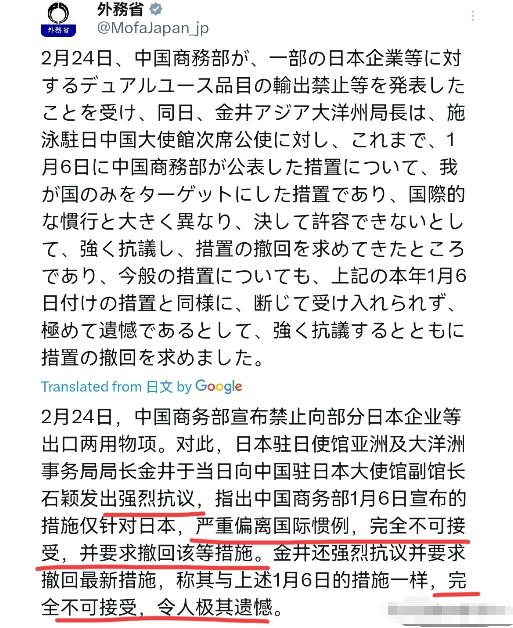 日本出来回应了!在我们将20家日本实体纳入管制清单之后,日本非常的愤怒!2月24日,日本外务省发表声明声称,中国商务部宣布对部分日本企业等实施两用物项出口禁令,日本已经对中国驻日本大使馆公使提出交涉。此前,针对中国商务部1月6日公布的相关措施,日本方面已明确表示:该措施仅以日本为对象,与国际通行惯例严重不符,绝对无法接受,并已提出强烈抗议,要求中方撤销相关措施。 这些被列入名单的日本企业绝非普通商事主体,它们几乎撑起了日本军工体系的核心产能。三菱重工旗下多家子公司参与了日本高超音速武器、驱逐舰、航空发动机的研制,川崎重工在航空航天领域的技术直接服务于军事扩张,富士通防卫与国家安全株式会社更是直接对接日本防务需求。 中方此次精准锁定这些实体,本质上是针对日本近年来加速“再军事化”的直接回应,日本却刻意回避自身军事扩张的现实,反而指责中方措施不符合国际惯例。 事实上,中方的所有操作都有明确的法律依据和国际法理支撑。 商务部新闻发言人和外交部发言人毛宁先后明确表态,这些措施完全依据《中华人民共和国出口管制法》和《中华人民共和国两用物项出口管制条例》制定,目的是制止日本的“再军事化”和拥核企图,既正当又合理合法。 作为《瓦森纳协定》成员国,日本本身就参与了国际通用的两用物项出口管制机制,却对中方基于同样原则的管控措施双重标准,这种立场本身就站不住脚。 日本的强烈反应背后,是其相关产业对中国关键材料的高度依赖。数据显示,日本对中国的重稀土依赖度达99%,镓的依赖度为98%,高纯氟化氢、碳纤维等多种支撑军工和高端制造的关键材料也主要从中国进口。 中方的管制措施直接击中了日本“寓军于民”体制的软肋,东京股市当天就给出了直接反应,三菱重工股价由涨转跌,一度下跌3.6%,IHI株式会社跌幅更是达到5.73%,川崎重工也下跌4.02%,防务与重型机械板块遭遇集中抛售。 被列入管控名单的多家日本企业已开始有所动作,三菱重工对外表示正在“调查”此事,IHI株式会社称会核实事实并持续关注事态发展,川崎重工也明确将确认中国出口限制的具体内容。 这些企业的紧张并非没有道理,失去中国的关键材料供应后,它们参与的潜艇建造、导弹研发、战机维护等项目都将面临停滞风险,有分析指出日本相关军工项目可能会出现18至24个月的延期,半导体复兴计划也可能倒退5至10年。 中方始终强调,相关措施仅针对少数参与日本军事扩张的实体,仅限制两用物项出口,不会影响中日正常经贸往来,诚信守法的日本实体完全无需担忧。 这一立场充分体现了中方的克制与区别对待,既没有扩大打击范围,也没有影响普通民生领域的合作。 日本方面如果真的希望维护双边经贸关系,更应该做的是反思自身不断突破和平宪法、加速军事扩张的行为,而不是一味指责中方的正当防卫措施。 国际社会都清楚,日本近年来不断增加防卫预算,修订“安保三文件”,谋求所谓“反击能力”,甚至推动军事出口合法化,这些举动已经严重破坏了地区和平稳定。 中方通过出口管制手段遏制日本军工体系扩张,既是维护自身国家安全,也是在履行防扩散的国际义务。日本与其沉浸在愤怒中提出无理抗议,不如正视自身行为引发的地区关切,停止军事冒险,通过对话协商解决分歧,这才是维护中日关系稳定的正道。