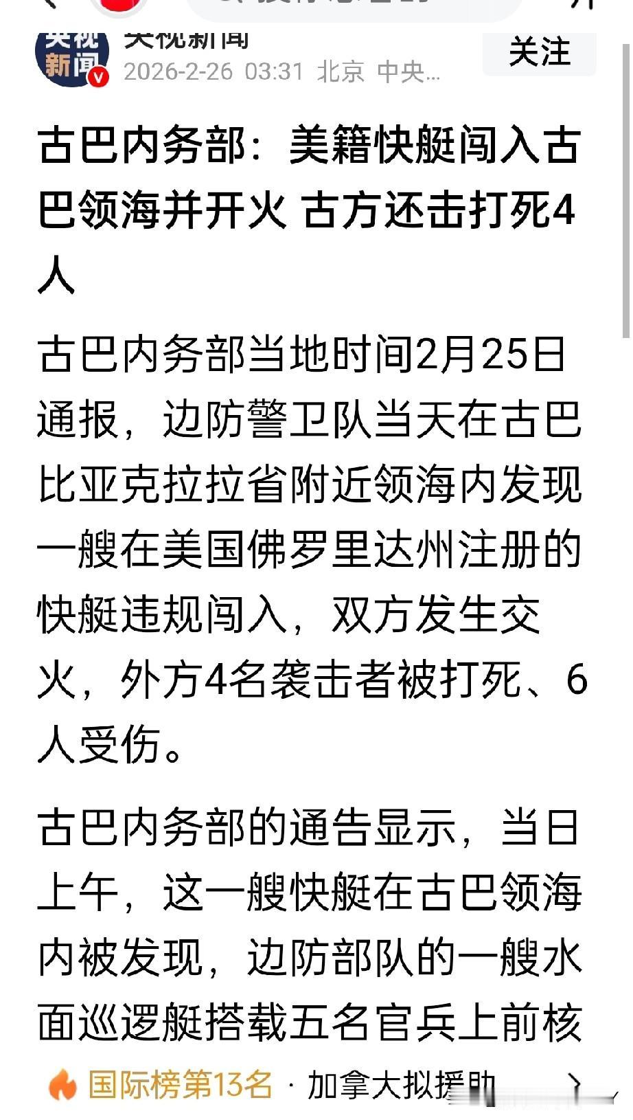 只要越界不服就开火,这就对了,英勇的古巴边防军好样的! 古巴内务部当地时间2月25日通报,边防警卫队当天在古巴比亚克拉拉省附近领海内发现一艘在美国佛罗里达州注册的快艇违规闯入,双方发生交火,外方4名袭击者被打死、6人受伤。 虽然全方面实力和美国差十万八千里,但是面对入侵者,没事畏畏缩缩更没有打口水战,古巴表现出捍卫国家主权的坚强勇气,令人肃然起敬! 古巴必须出击,美国人这是在试探古巴的反应。然后得寸进尺,要以马杜罗为教训,忍让不是选项,敢于亮剑是唯一的丛林法则。 对于来犯之敌,敢打才是硬道理,你打那是因为敌人侵犯了你的利益。面对敌人的挑衅,只有敢于出击才能让敌人有所顾忌。不然,敌人永远都认为你软弱可欺。 当年,卡斯特罗亲临火线,打响了举世闻名的72小时反击美雇佣军战役,大获全胜并俘虏了大量美雇佣军。所以,古巴与伊朗和委内瑞拉不一样。 美国人凭借自己的实力到处入侵别国领土和领海,全世界人民要敢于反抗。如果选择跪下求饶,只能被欺负得更惨。 消息来源:@央视新闻
